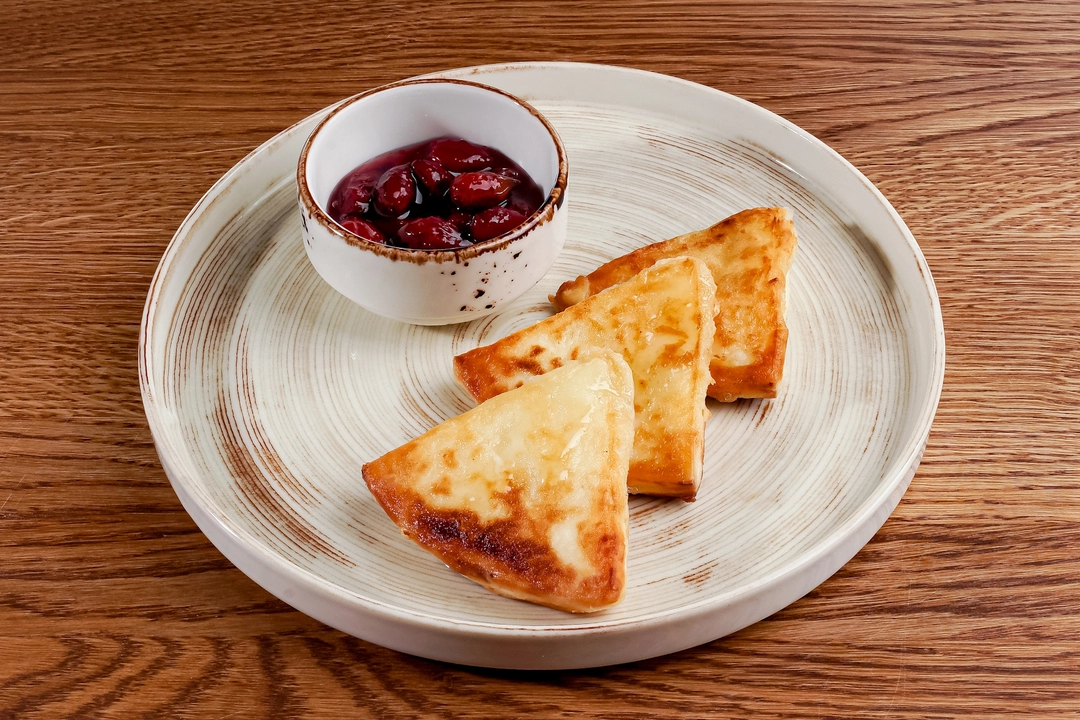 Сыр сулугуни, обжаренный на растительном масле с добавлением меда. Подается с кизиловым вареньем