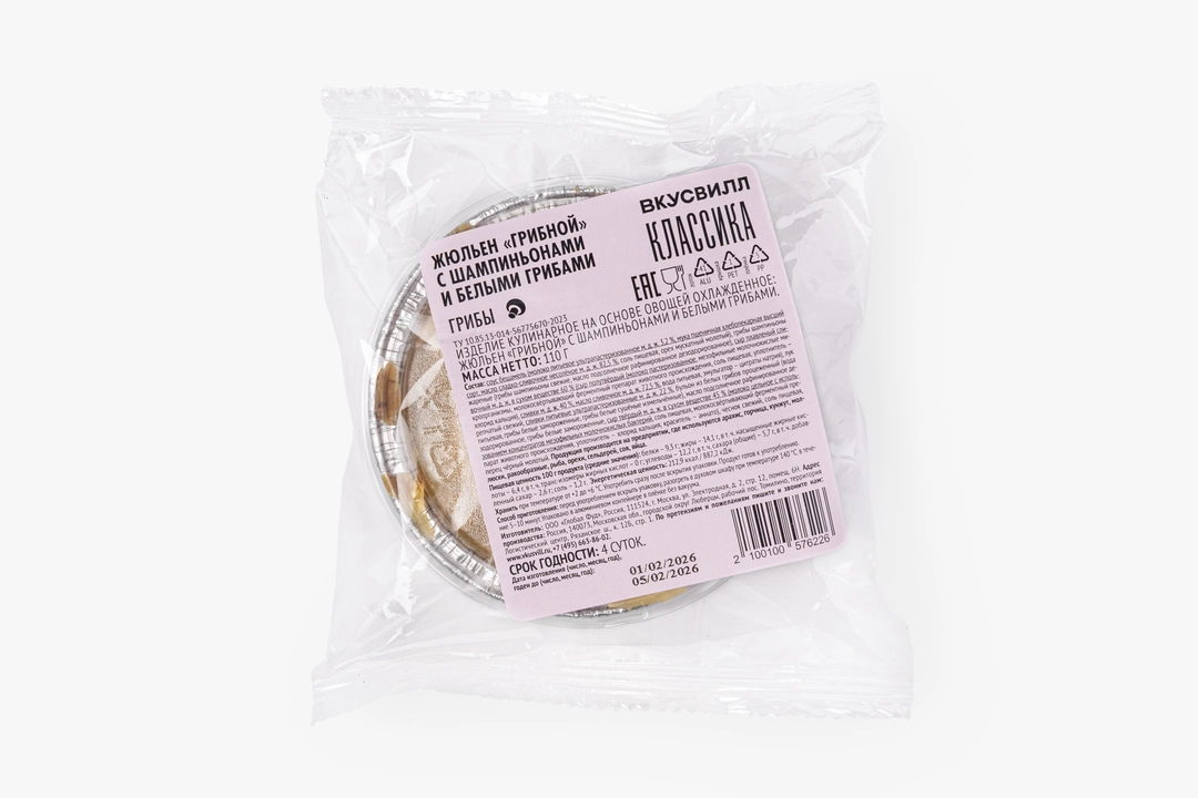 Густой грибной жюльен в сливочном соусе для любителей классических закусок. Мы приготовили основу из обжаренных шампиньонов и белых грибов в грибном бульоне, добавили бешамель с мускатным орехом и лук. Плавленый и твёрдый сыр придают блюду нежную, тягучую текстуру. Подогрейте его перед подачей прямо в фольгированной упаковке, чтобы сверху образовалась аппетитная румяная корочка. Можно использовать для этого как духовой шкаф, так и микроволновую печь. Это традиционное блюдо, пришедшее к нам из французской кухни, украсит не только праздничный стол, но и придаст торжественности повседневному ужину.