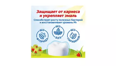 Новая детская зубная паста от любимого бренда Colgate со вкусом сочного арбуза для детей в возрасте от 6 до 9 лет помогает детям начать самостоятельно заботиться о своем здоровье, способствует росту полезных бактерий и восстанавливает здоровый уровень ph (водородный показатель, характеризующий концентрацию свободных ионов водорода в воде). Ваш ребенок на пути к здоровой улыбке на всю жизнь! - Подходит для детей от 6 лет, 7 лет, 8 лет и 9 лет - Не содержит SLES (Sodium Lauryl Sulfate лауретсульфат натрия), парабенов, глютена, сахара - Содержит аргинин, природный компонент, способный подавлять рост кариесогенных бактерий - Не содержит агрессивных абразивных частиц - 100% натуральный вкус - Не содержит фторида - Не содержит искусственных ароматизаторов, подсластителей, консервантов, красителей - Подходит как для девочек, так и для мальчиков - Внутри каждой пачки небольшой сюрприз для родителей и ребенка. Любимый вкус арбуза придется по вкусу вашему ребенку и поможет мотивировать ребенка к регулярной гигиене полости рта. Первичной упаковкой продукта является картонная упаковка. Целостность первичной упаковки обеспечивается запаиванием картонной упаковки в момент производства. Страна производитель-Китай