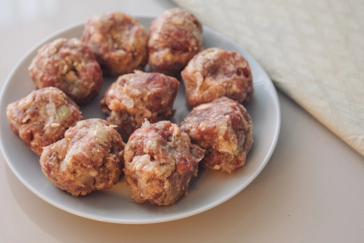 Мясо режем на кубики, добавляем лук и пропускаем через мясорубку. Хорошо перемолотый фарш солим и перчим. Делим его на шарики примерно по 50 граммов.