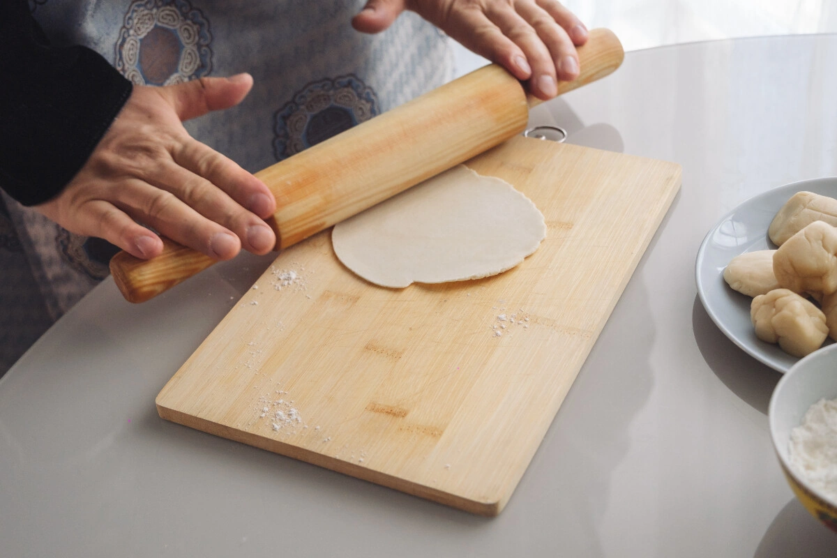 Пока мы готовили фарш, тесто настоялось. Его нужно превратить в «блинчики». Рабочую поверхность присыпаем мукой, тесто начинаем руками вытягивать в колбаску, режем её на одинаковые кусочки и раскатываем их скалкой. Должны получиться лёгкие и тонкие блинчики, но без просветов. Складываем их стопкой. Воду в кастрюле или пароварке ставим на огонь заранее, чтобы успела закипеть. Можно приступать к лепке!