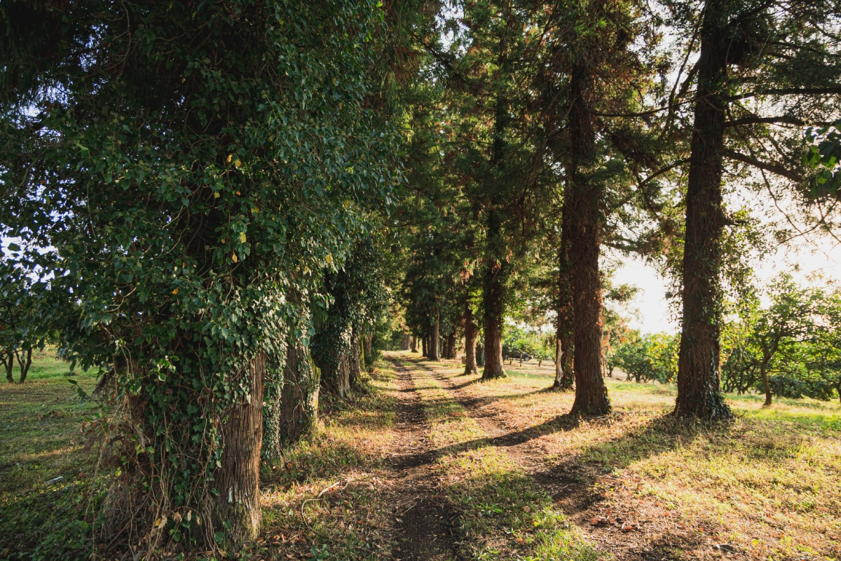 Мы шли по дорожке, а с двух сторон нас окружали деревья, горы на фоне голубого неба и тёплое солнце. Мы даже оставили верхнюю одежду в машине и шли в одних футболках, хотя на улице было 11 ноября.