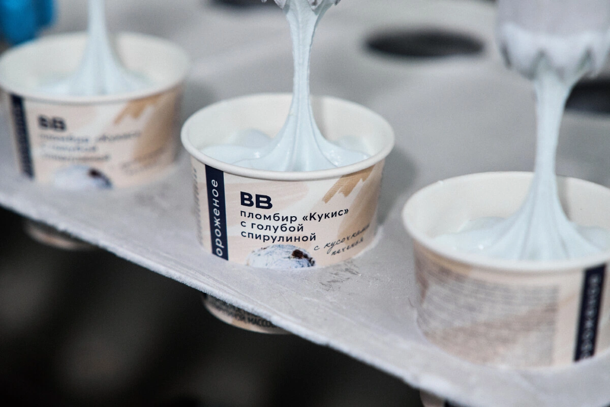 «На технологической линии молоко нагревается до 60 градусов и начинает циркулировать, образуя воронку, куда потом засыпаются сухие ингредиенты: сахар и стабилизаторы. А параллельно работают маслотопки — ванны с решётками, которые подогреваются и растапливают масло и сливки. Затем всё перемешивается в танкере и перекачивается для дальнейшей пастеризации и гомогенезации. Дальше — процесс охлаждения и заморозки. Уже после фрезеровки в мороженое добавляются кусочки печенья, иначе оно не сможет удержать свою форму и размокнет», — рассказывает технолог Валентина Ковалёва.