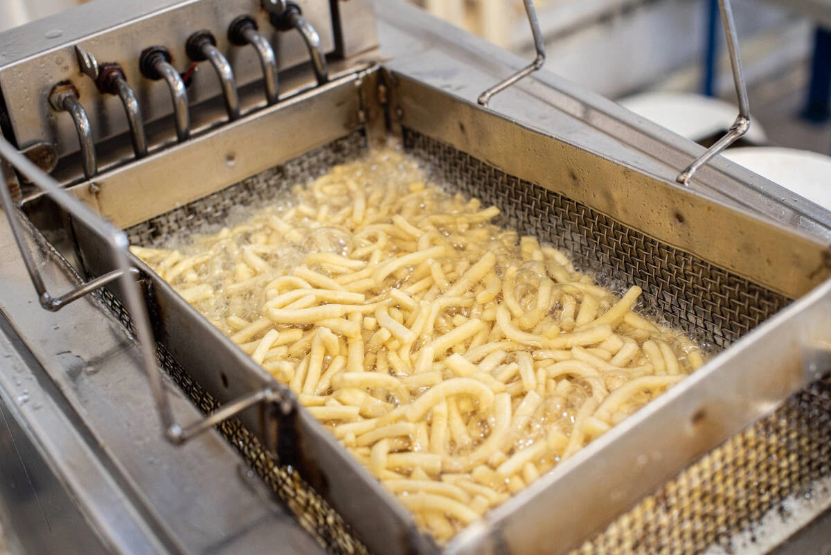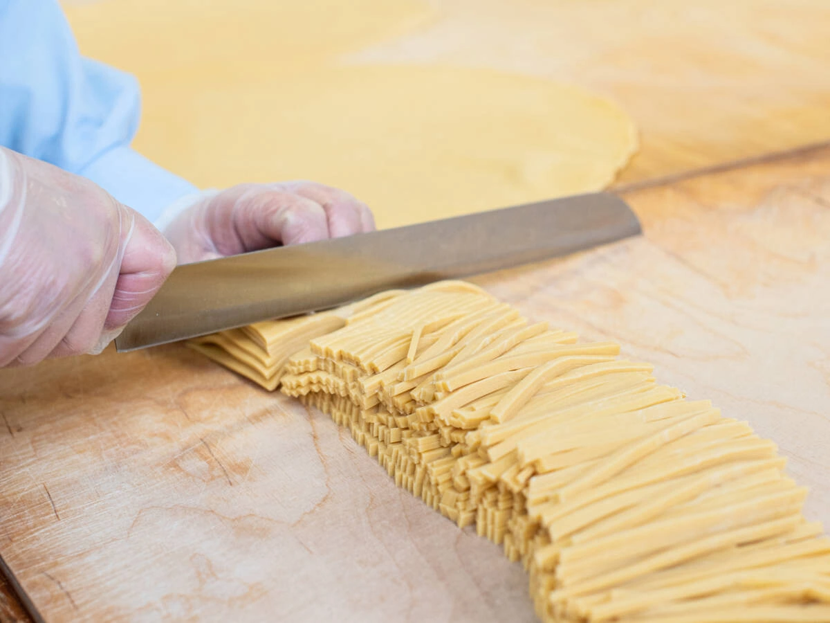 Тесто для чак-чака раскатывают тонкими пластинами и оставляют на 10–15 минут под плёнкой. А затем вручную нарезают небольшими колбасками и отправляют в кипящее масло.