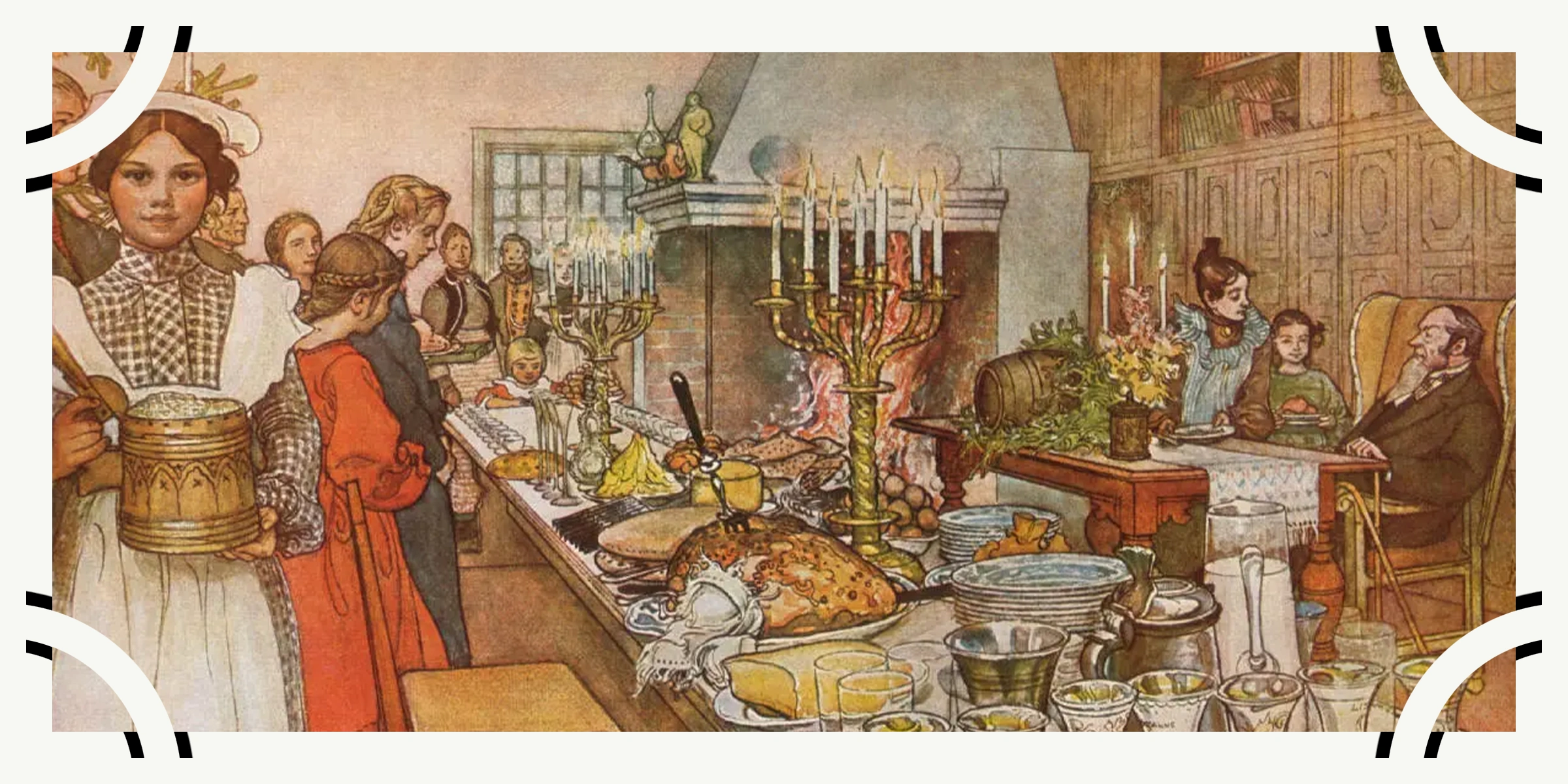 Ну а теперь — к шведскому столу! Рождественскую ветчину (запечённый свиной окорок), студень, колбаски, пожалуй, можно назвать старожилами того набора, который описан в отрывке. Эти блюда сохранились ещё со времён Средневековья: скандинавы традиционно забивали свинью перед днём святой Люсии (13 декабря) — важного праздника, который неукоснительно отмечают и по сей день.
