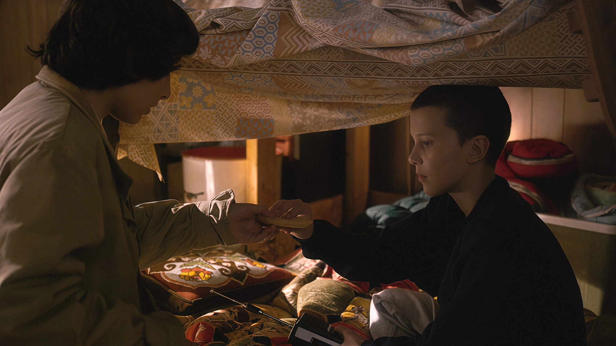 И у неё действительно проблемы. Одиннадцать сбежала из лаборатории: места, где она росла, но не чувствовала себя ребёнком. За ней — погоня. И в этой сцене она впервые сталкивается с непотребительским отношением к себе. Разве так бывает? Для девочки, которая всю жизнь была чьим-то объектом, бургер и картошка — что-то нормальное, обычное, чего ей так не хватало.