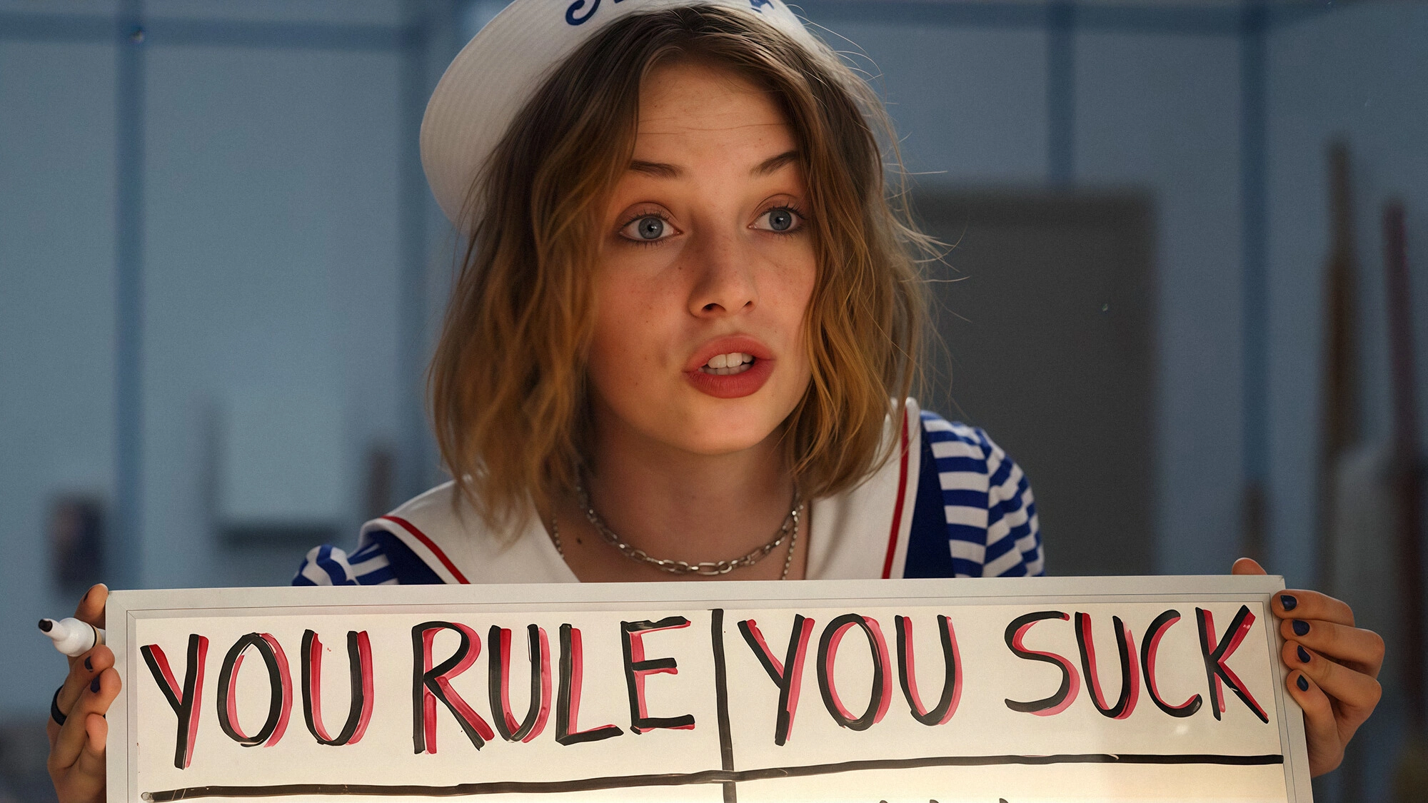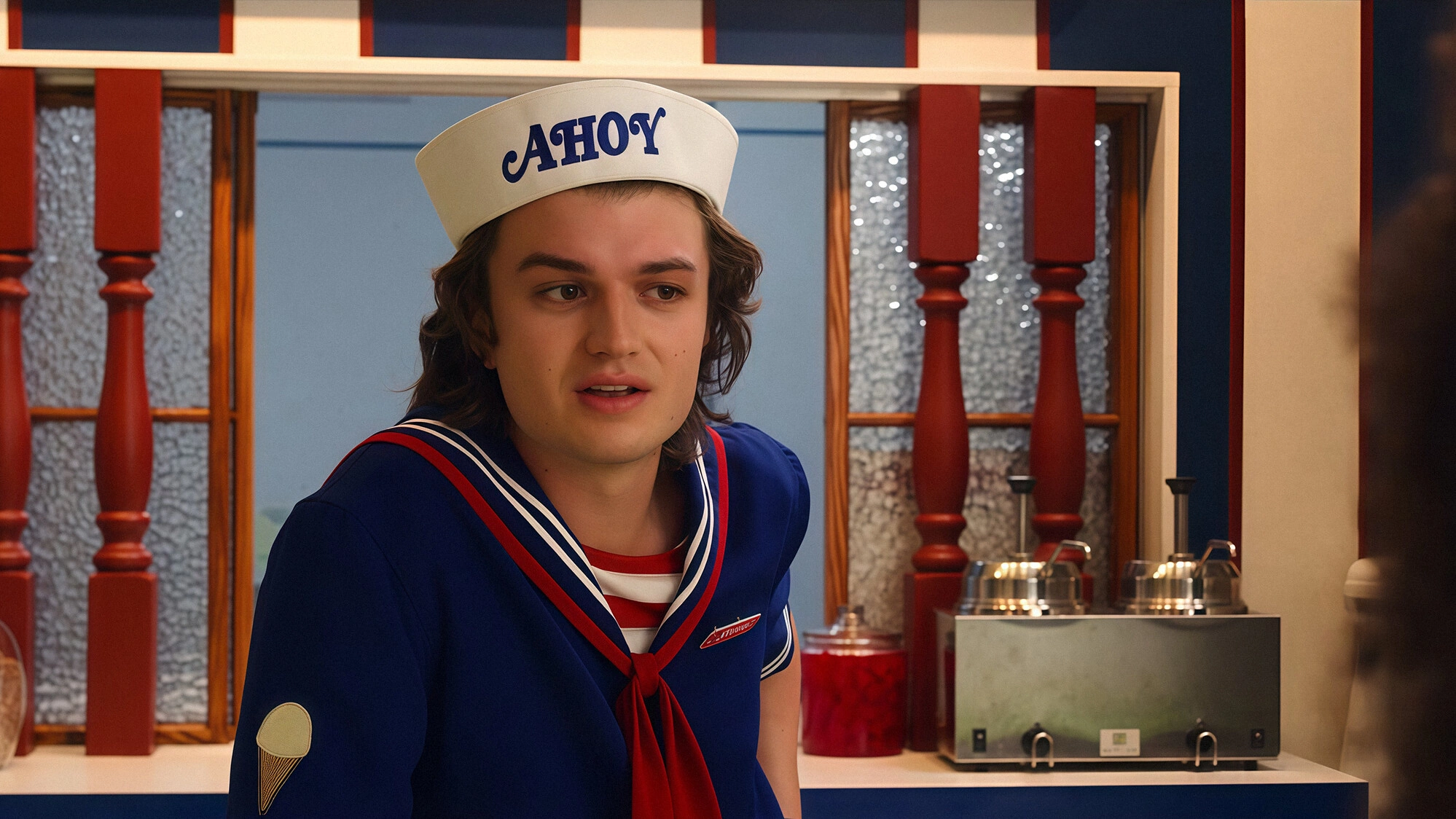 Стив изображает плейбоя, флиртует с посетительницами, но безуспешно. А Робин не стесняется его за это подкалывать. Их отношения развиваются в лёгкости. Пока оба не находят в морозилке ход к военной базе.
