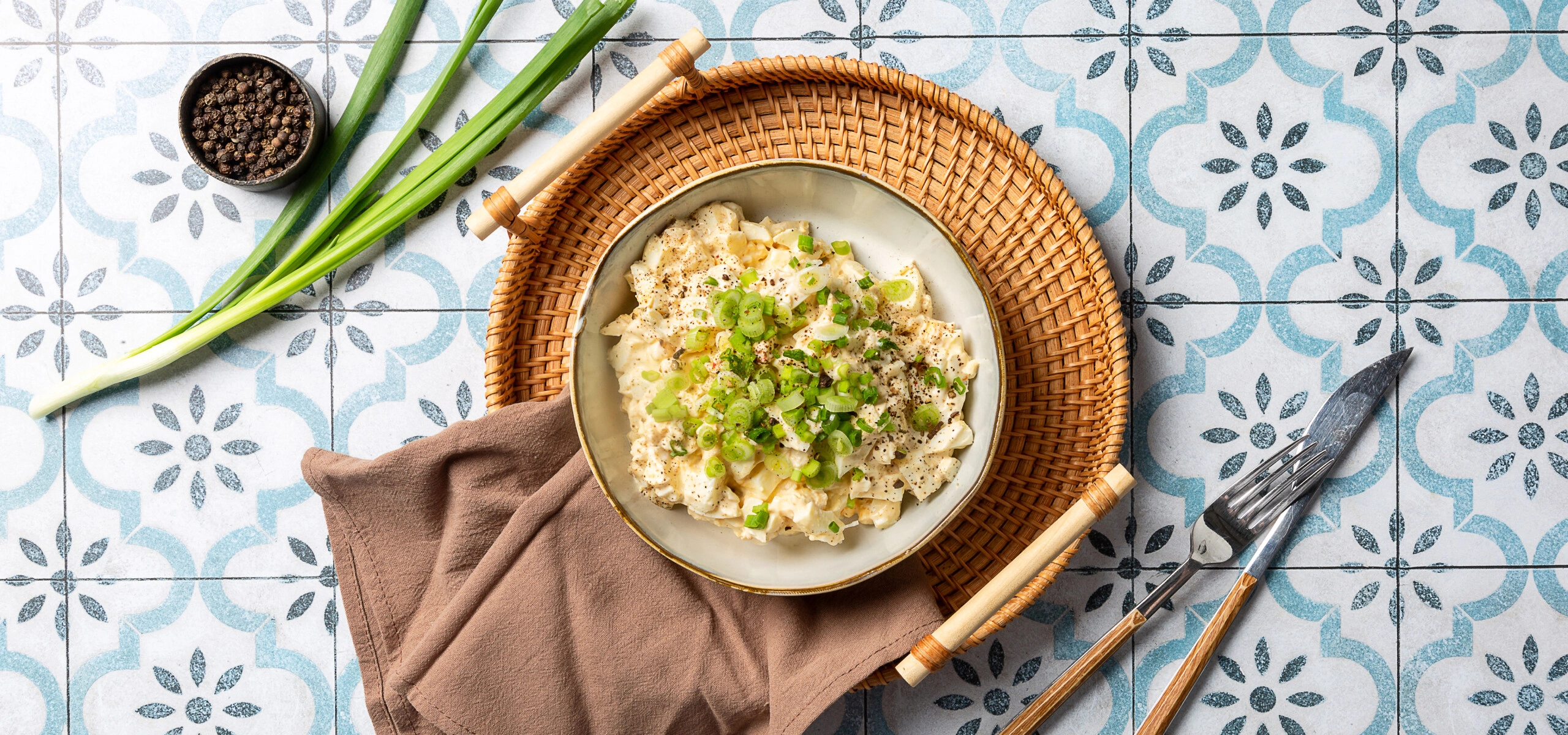- Смешайте заправку с нарезанными яйцами и украсьте салат рубленым зелёным луком.