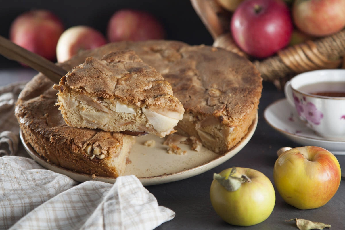 - Яблоки нарежьте дольками, выложите в форму, посыпьте рублеными орехами и залейте тестом. Поставьте пирог в горячую духовку и выпекайте 35–40 минут. Проверьте готовность деревянной шпажкой. Вкуснее всего шарлотка в остывшем виде, подавайте к чаю.