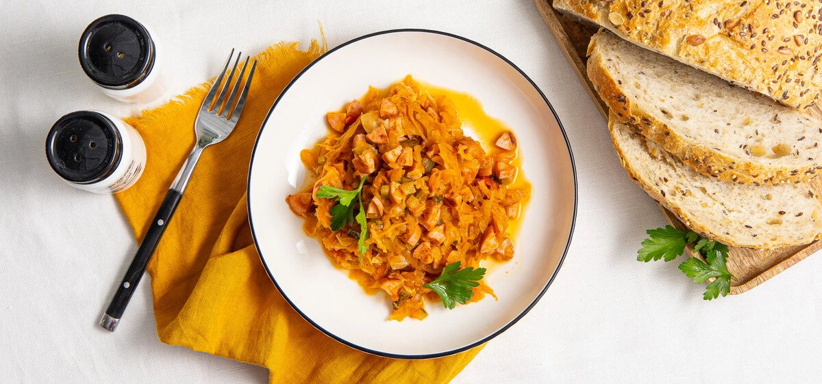 Блюдо со вкусом ностальгии! Такую солянку можно приготовить с сосисками, колбасками, копчёной рулькой или куриным филе. А если заменить часть свежей капусты на квашеную, вкус станет ещё интереснее. Подавайте солянку как самостоятельное блюдо или, следуя любимому рецепту нашего редактора, с картофельным пюре.