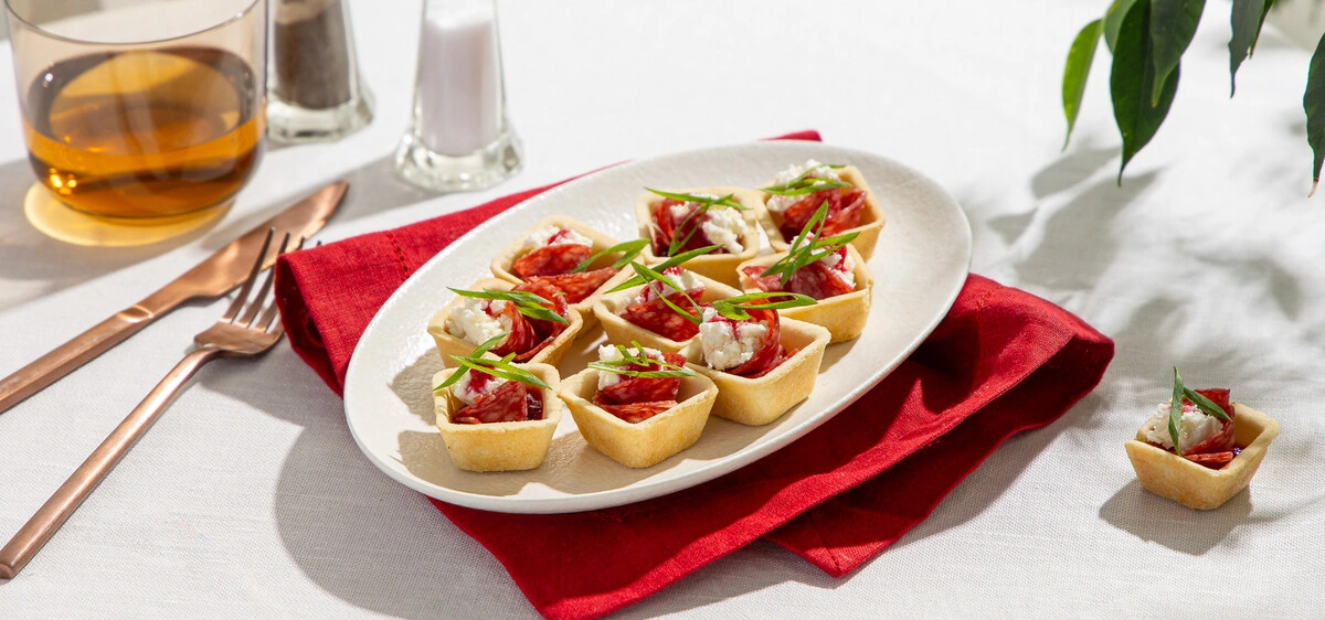 Изюминка этого рецепта — пряный клюквенный соус с апельсиновой цедрой. С нежным сырным кремом и ломтиками пикантной салями получается элегантная закуска для праздничного стола, которая приятно удивит ваших гостей.