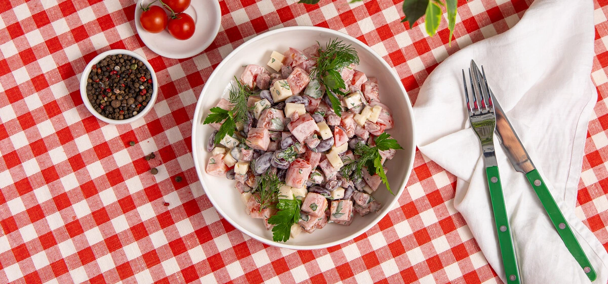 Это простое блюдо собирается за 10 минут, но по насыщенному вкусу и интересному сочетанию ингредиентов не уступает другим популярным салатам с майонезом. Пикантная колбаса, сытная фасоль и хрустящие овощи — беспроигрышный рецепт для любого застолья.