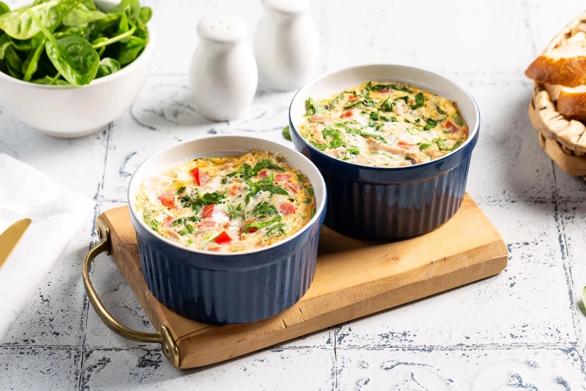 Сытный и полезный омлет, который приготовится быстрее, чем вы примете утренний душ. Для запекания подойдёт любая форма: одна большая на семью или маленькие для индивидуальных завтраков.
