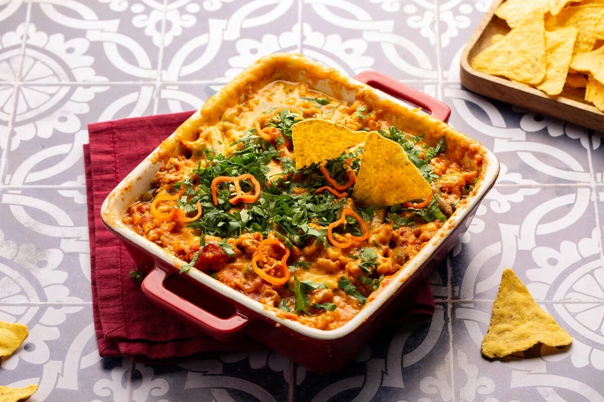 Идеальное блюдо для большой компании: быстрое, сытное и вкусное! Остроту соуса легко регулировать: добавляйте больше или меньше перца хабанеро по вкусу. По желанию вместо начос к блюду можно подать слегка подпечённые лепёшки-тортильи.