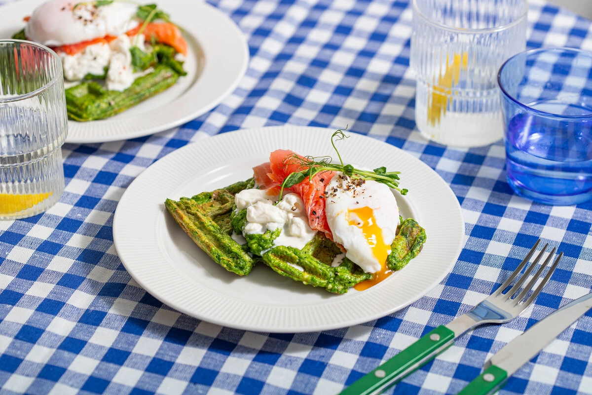Вафли из шпината — это не только полезно, но и очень вкусно. А если добавить к ним ломтики слабосолёной рыбы, страчателлу и яйцо пашот, получится роскошный вариант высокобелкового завтрака. Бонус: вафли можно испечь заранее и убрать в морозилку, чтобы сэкономить время утром.