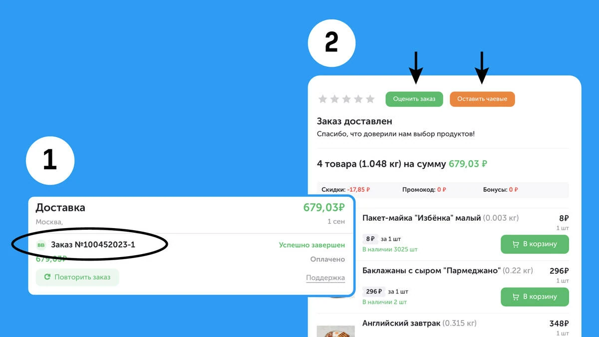 Вы можете поставить оценку завершённому заказу и оставить чаевые курьеру, который его доставил. Сотрудникам чаевые начисляются вместе с зарплатой. Также после оценки заказа можно будет оставить чаевые и сборщику.
