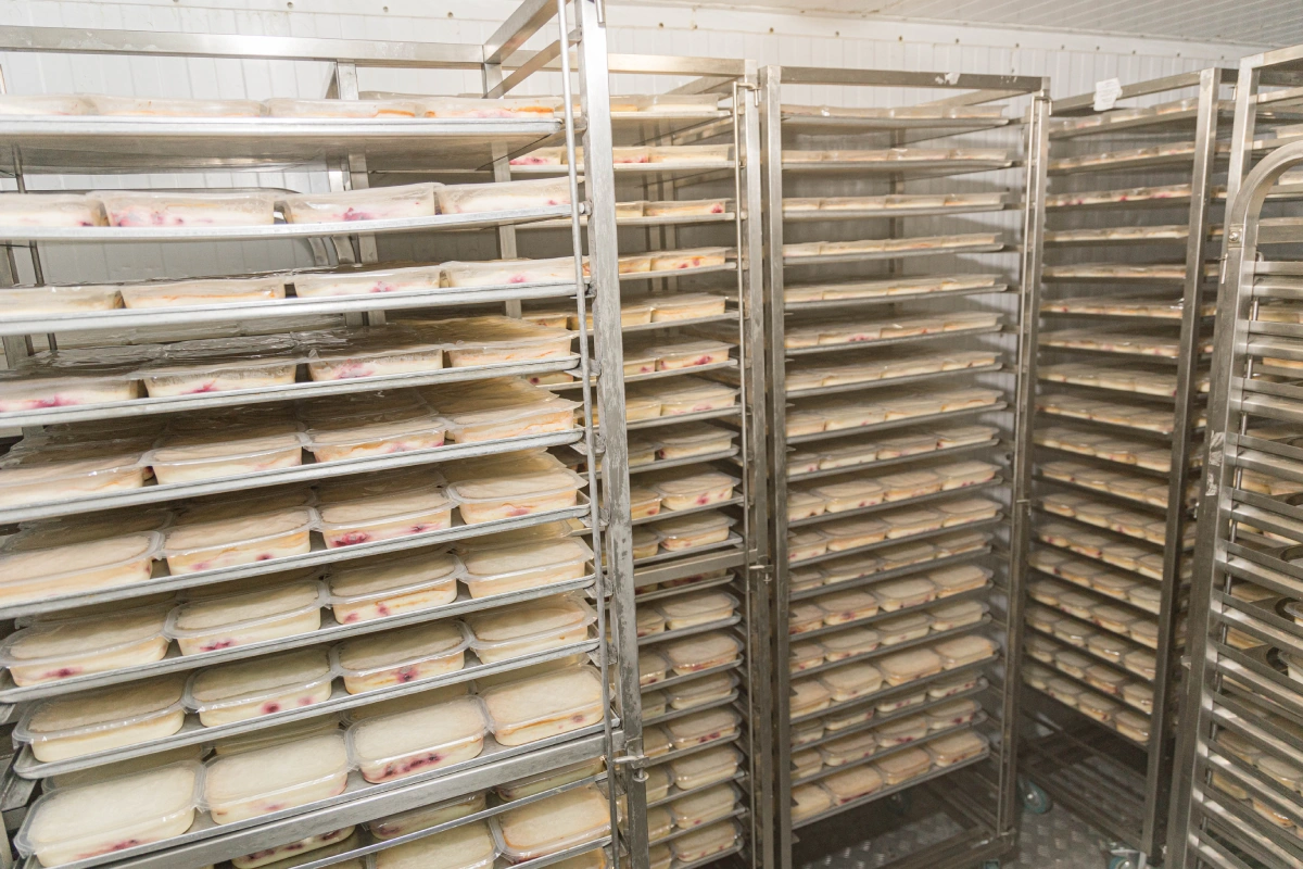 После запеканку перевозят в морозильные камеры. Через два часа она остывает, и её отправляют в отдел упаковки. В нём две линии: одна полностью автоматическая, а другая полуавтомат. На второй линии этикетки вручную наклеивают люди, а машина только запаивает контейнер, убирая изнутри воздух.