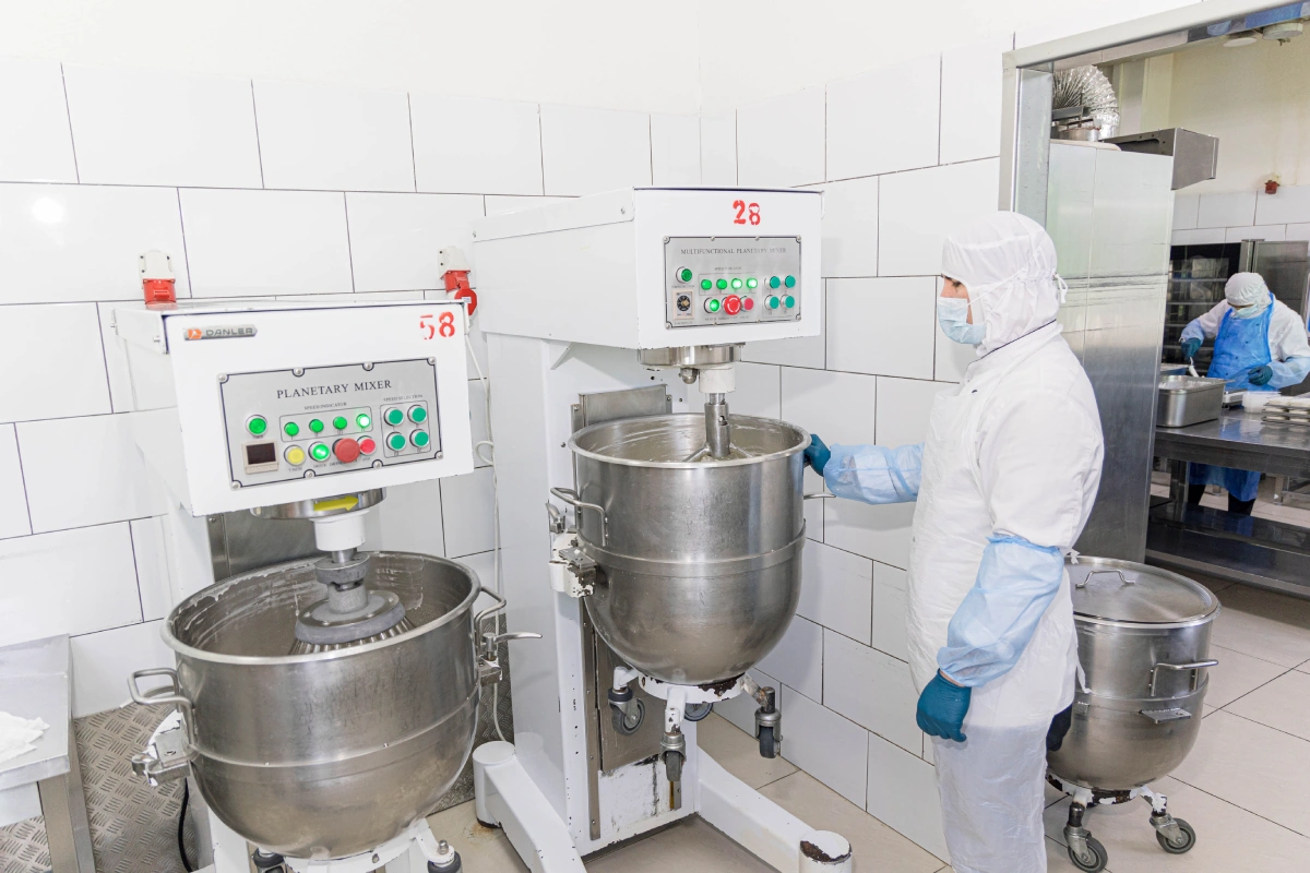 Цеха расположены друг за другом — по ходу технологического процесса. Например, начинается работа над запеканками с подготовки сухих ингредиентов. Поэтому первый цех на пути сотрудников — как раз склад с мукой и сахаром. Следующий шаг — подготовка яиц, а значит, дальше находится комната, где их моют и разбивают. По сути, если идти по производству без остановки, то можно сделать круг и вернуться в точку, откуда начинался путь.