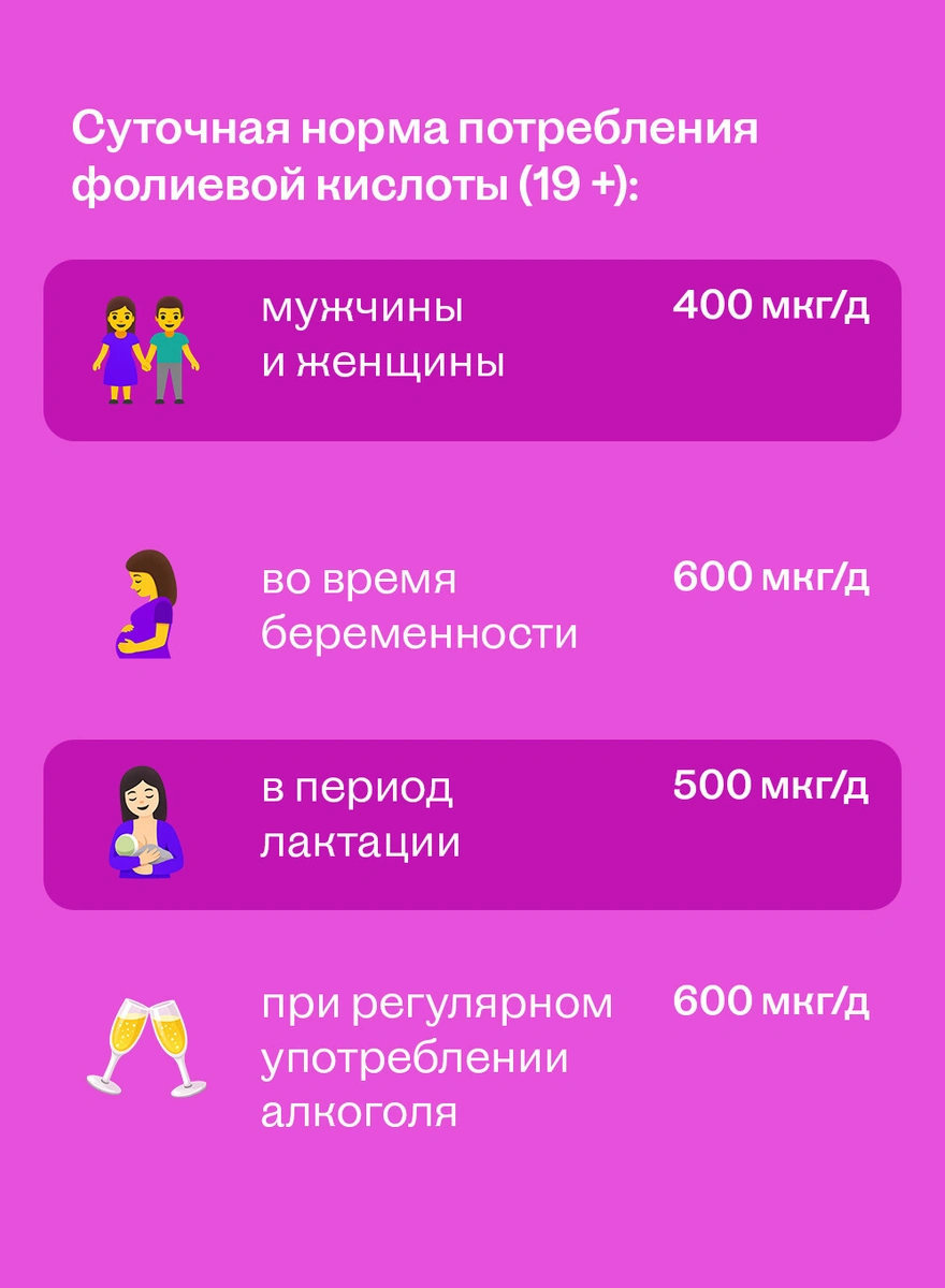 Рекомендуемая суточная норма фолиевой кислоты для здоровых взрослых мужчин и женщин составляет 400 мкг в день . Однако для женщин, которые беременны или планируют беременность, эта доза увеличивается.