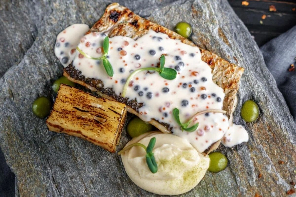 «Новосибирская кухня — понятие относительное. Она в основном привозная, позже адаптированная под особенности региона. Сибирские продукты в нашем меню — это в первую очередь ягоды: брусника и морошка. Морошка у нас присутствует и в салатах, и в соусах, и в виде ферментированного продукта — мочёные ягоды. Кедровый орех, дикое мясо, в основном оленина, и дикая рыба: муксун, ленский омуль, чир, нельма. Ещё к истинно сибирским продуктам я бы отнёс черемшу.