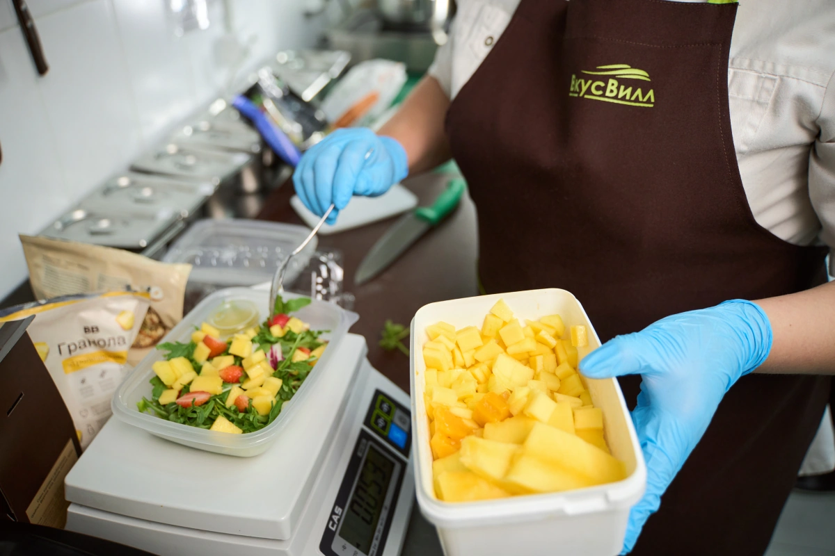 Простые блюда, такие как каши, омлеты и салаты, мы готовим здесь же, на кухнях дарксторов. Сложные блюда — супы и вторые блюда — делают и привозят нам в замороженном виде поставщики ВкусВилла, а мы уже в профессиональных микроволновых печах доводим еду до кулинарной готовности. Какие-то рецепты блюд поставщики адаптировали для нашей кухни, другие создали вместе с нами с нуля.