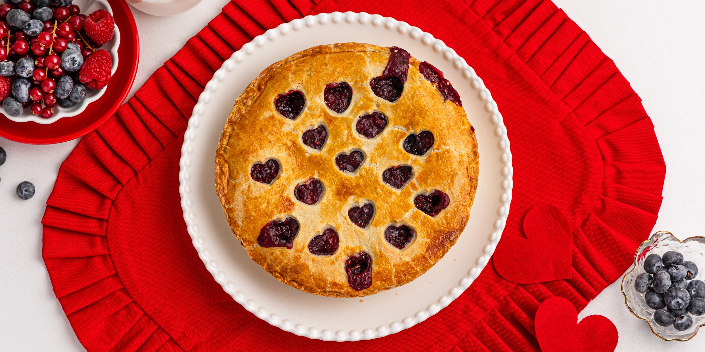 - Раскатайте вторую часть теста по диаметру формы и вырежьте с помощью металлического каттера отверстия-сердечки. Выложите полученную заготовку на начинку и прижмите по краям.