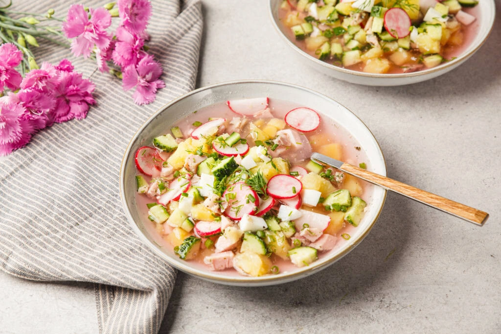 Для любителей окрошки — необычный и очень эффектный вариант на розовом квасе. По вкусу окрошка получится максимально классической, с кислинкой, зато удивит цветом.