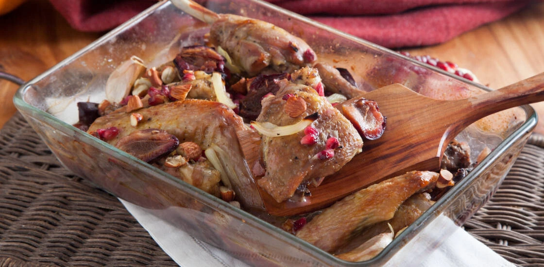 Цесарка со сливами, орехами и гранатом