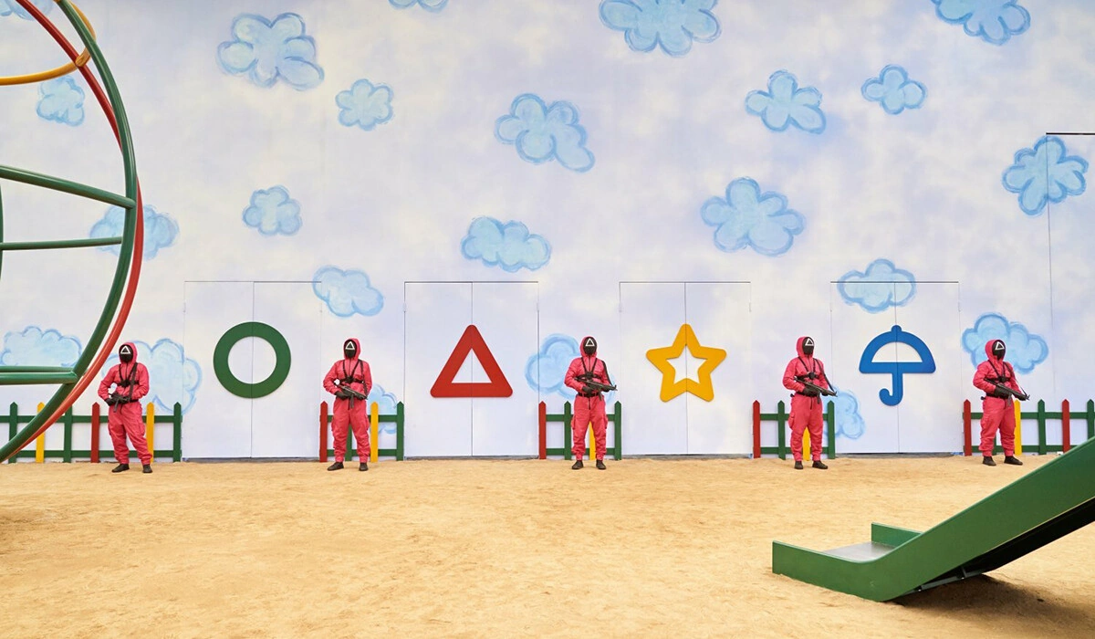 Контраст жестокости и «детскости» определяет сюжет. Испытания происходят не в комнатах пыток, а на фоне голубого нарисованного неба и каруселей. Даже гробы, в которых выносят тела проигравших, пусть и чёрные, но с розовой лентой и бантом. Такая вот инфантилизация насилия.
