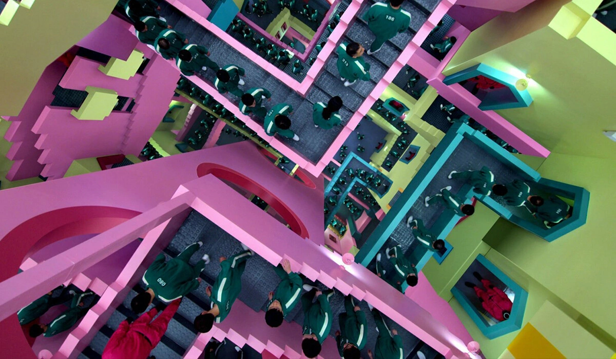 Экстерьер «Игры в кальмара» нарочито детский. В сериале нет разделения женщин и мужчин: все спят вместе в одной большой спальне для тихого часа. Комнаты декорированы под детские площадки. Еда, выносимая по расписанию, подана в судочках — будто приготовлена мамой на обед, чтобы ребёнок взял с собой.