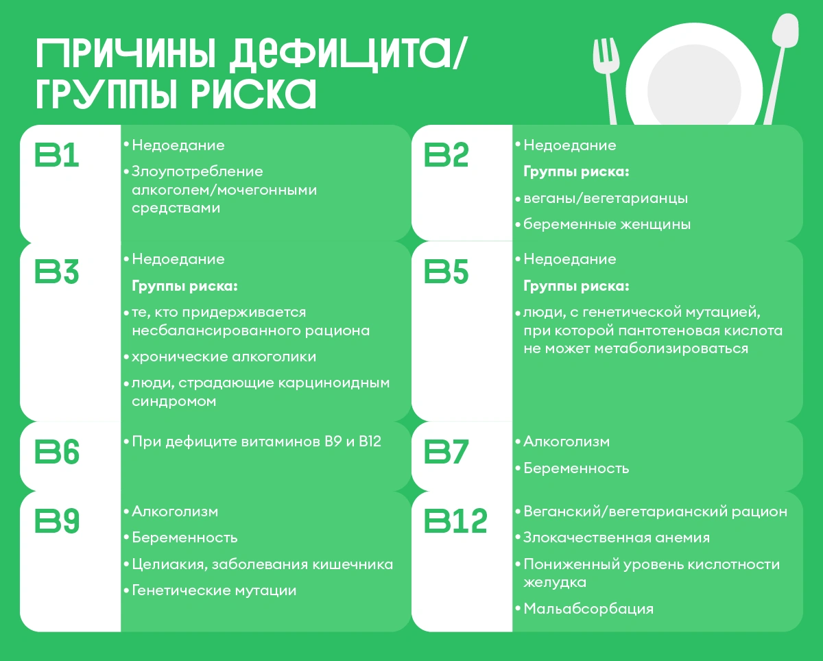 Дефицита витаминов группы В достичь достаточно сложно, ведь ведь список продуктов, содержащих эти вещества, довольно разнообразен. Однако в определённых условиях это всё-таки может произойти. Дефицит в большинстве своём случается из-за общего недоедания и несбалансированного рациона, но есть и другие причины.