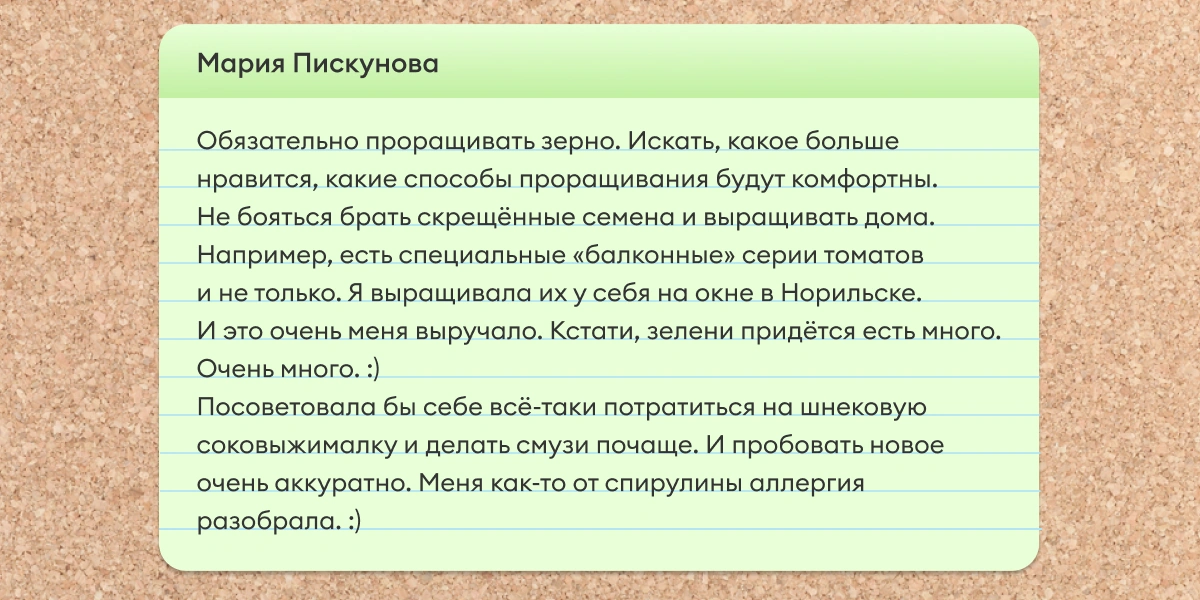 А мы делимся историями читателей из наших соцсетей, а также рекомендациями психолога ВкусВилла Станиславы Зарудной и нутрициолога Виктории Вишняковой.
