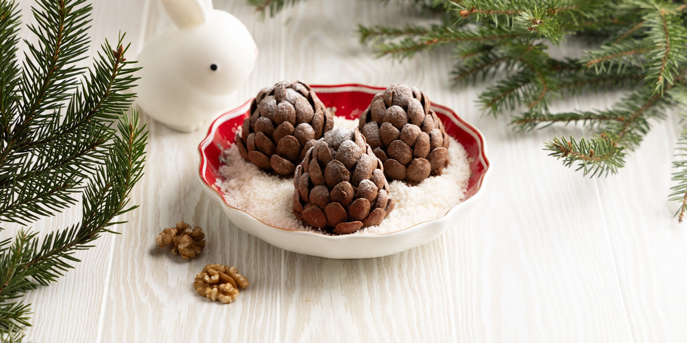 - Слепите из охлаждённого теста конусы — будущие шишки — весом примерно 50 г каждый. Начиная с верхней части, аккуратно втыкайте шоколадные ракушки в конус по кругу, чтобы получились шишки. По желанию присыпьте готовые шишки сахарной пудрой.