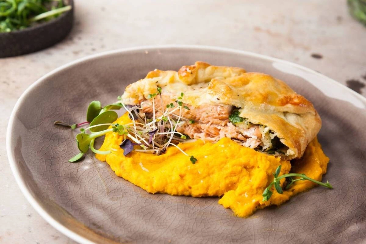 Горбуша — это тоже лосось, но вполне бюджетный. А горячее из неё может быть ничуть не хуже, чем из сёмги, форели или кижуча. Если выбрать правильный способ приготовления — например, запечь в тесте со шпинатом, а подать с тыквенным хумусом.