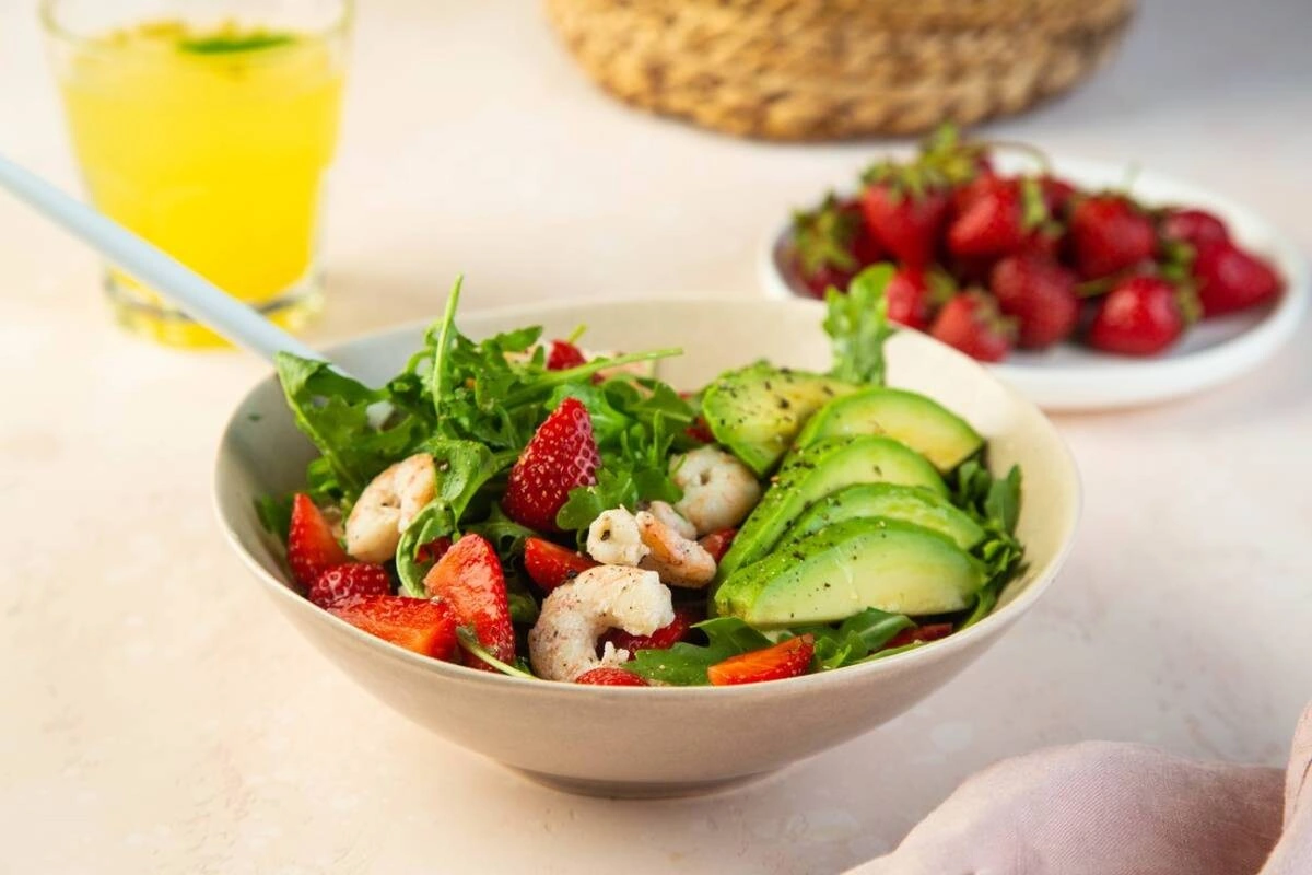 - Руколу помойте, обсушите и выложите в салатник, добавьте авокадо, креветки и клубнику, заправьте салат и перемешайте, поперчите и подавайте.
