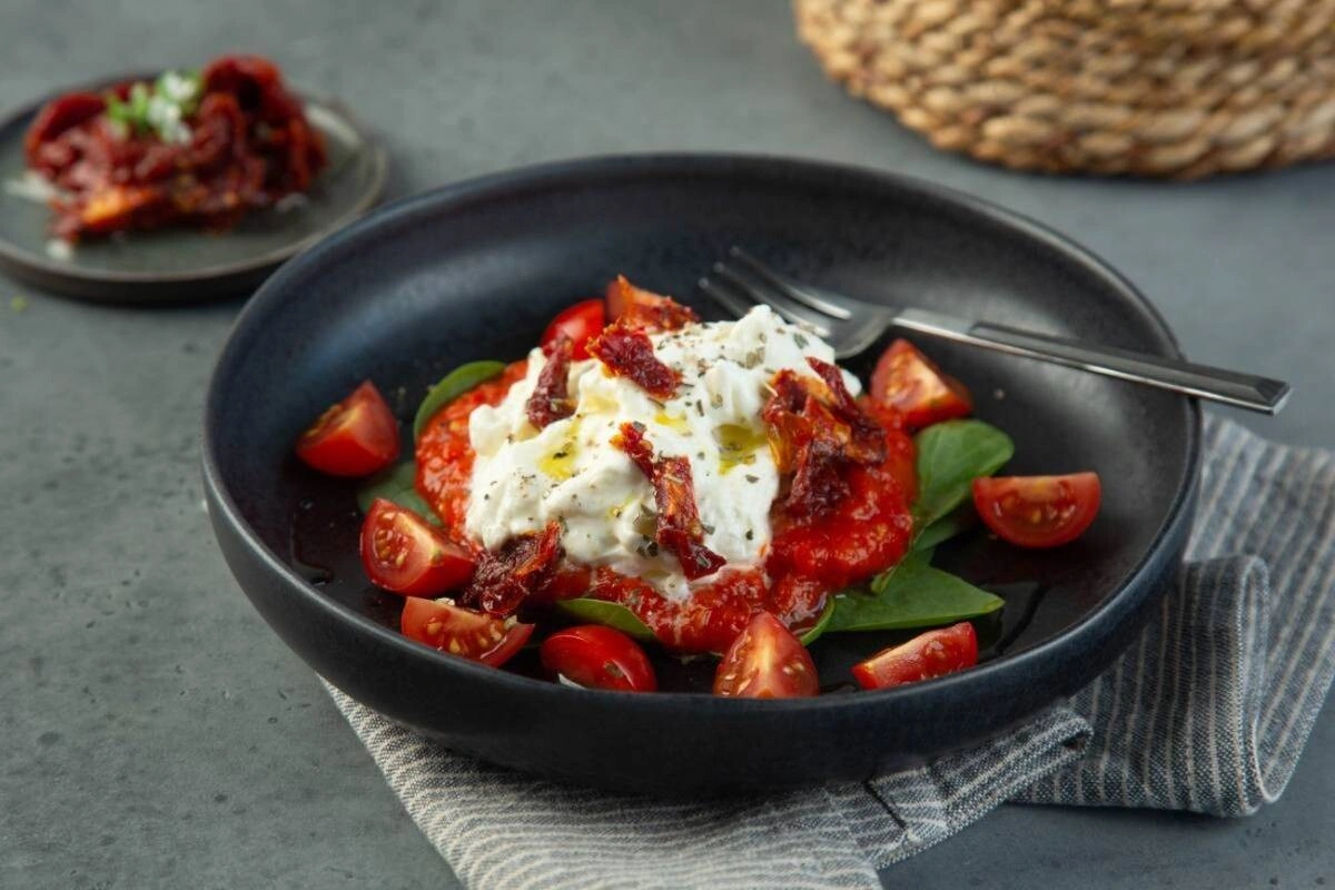 - В конце выложите сверху на перечный крем страчателлу, добавьте вяленые помидоры, посыпьте орегано и украсьте капельками оливкового масла.