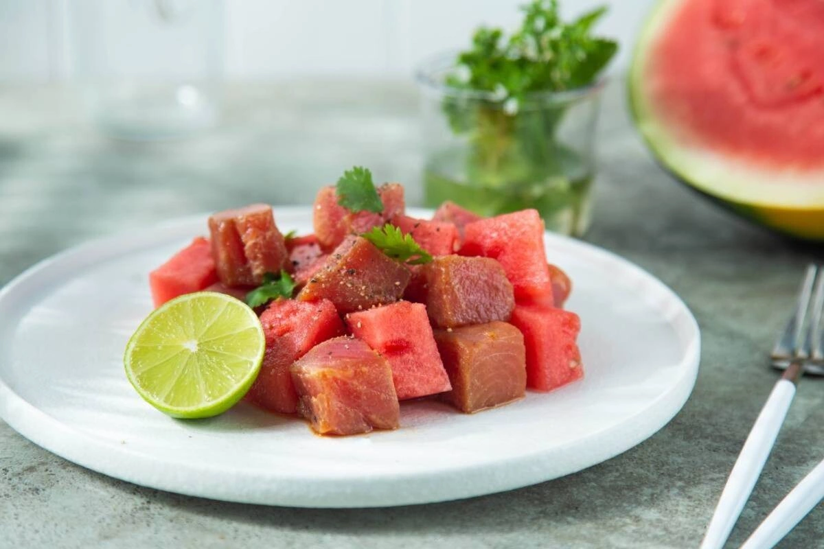 - Нарежьте арбуз такими же кубиками, аккуратно перемешайте с тунцом и выложите на тарелку. Украсьте дольками лайма, посыпьте листиками кинзы, поперчите. При желании можно чуть-чуть сбрызнуть кунжутном маслом или посыпать кунжутом.