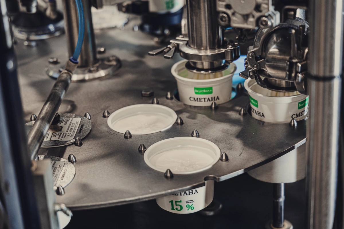 Излишки сливок после сепарации и пастеризации отправляются в цеха, где готовят сметану и масло. Для производства сметаны в танки закачивают сливки и закваску. Операторы цеха запускают программу, и машина сама начинает процесс. Квасят девять часов, и к утру сметана готова.