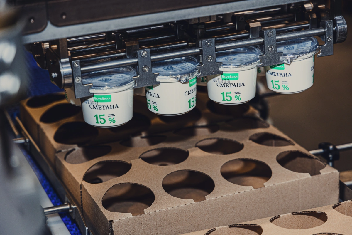 Всё это происходит на одном конвейере, процесс непрерывный и завораживающий. Тут же на упаковки клеят знак качества «Честный знак». Это тот самый QR-код, который покупатели ВкусВилла сканируют на кассах самообслуживания. Он нужен, чтобы Национальная система цифровой маркировки и прослеживаемости товаров контролировала нелегальный оборот продукции и следила, чтобы их не подделывали. Ещё по такому коду любой желающий может узнать о производителе, составе, дате изготовления и сроке годности товара, проверить ветеринарный сертификат.