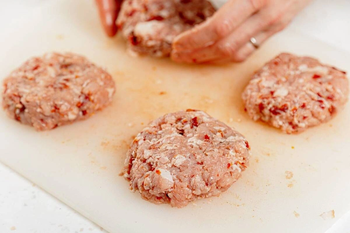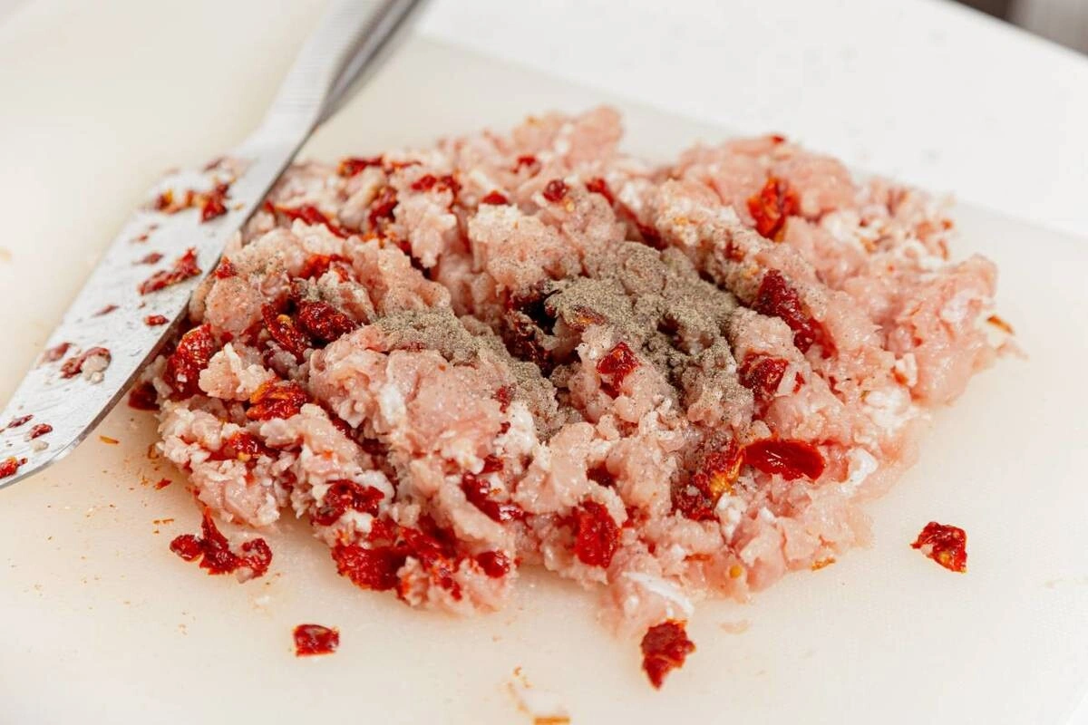 - Свинину нарежьте полосками, а затем мелко нарубите ножом. Мелко порубите бекон, добавьте к мясу, посолите и поперчите. Можно также мелко нарубить в котлеты вяленые томаты или добавить сыр. Вымесите руками и отбейте фарш.