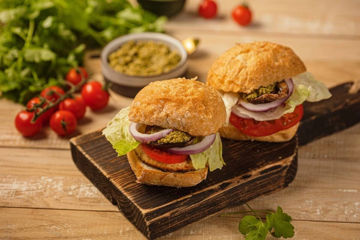 - Соберите бургеры: булочку намажьте соусом песто, затем выложите котлету, потом помидор и айсберг, затем лук и грибы, сверху добавьте ещё соуса и накройте верхней частью булочки.