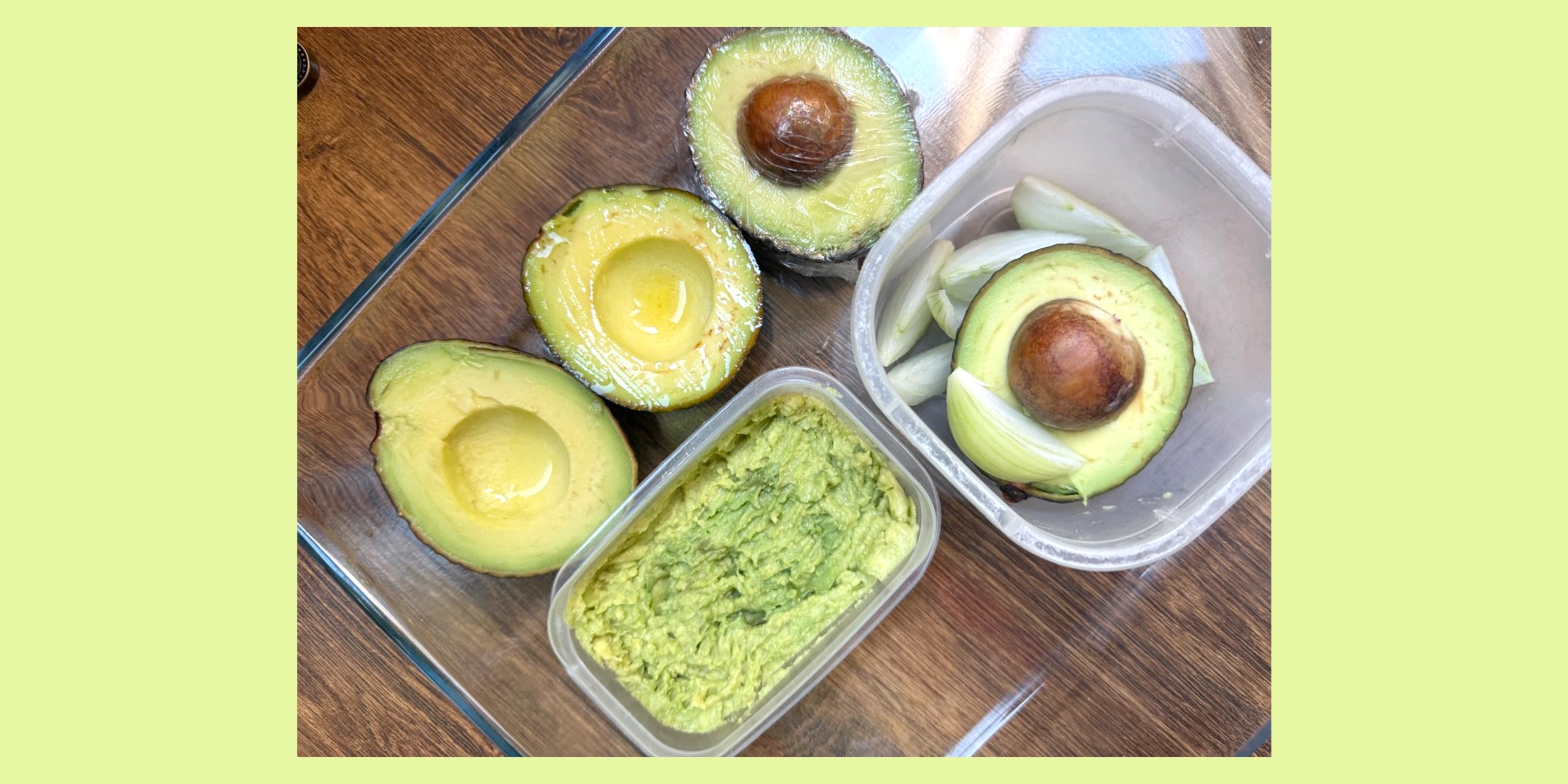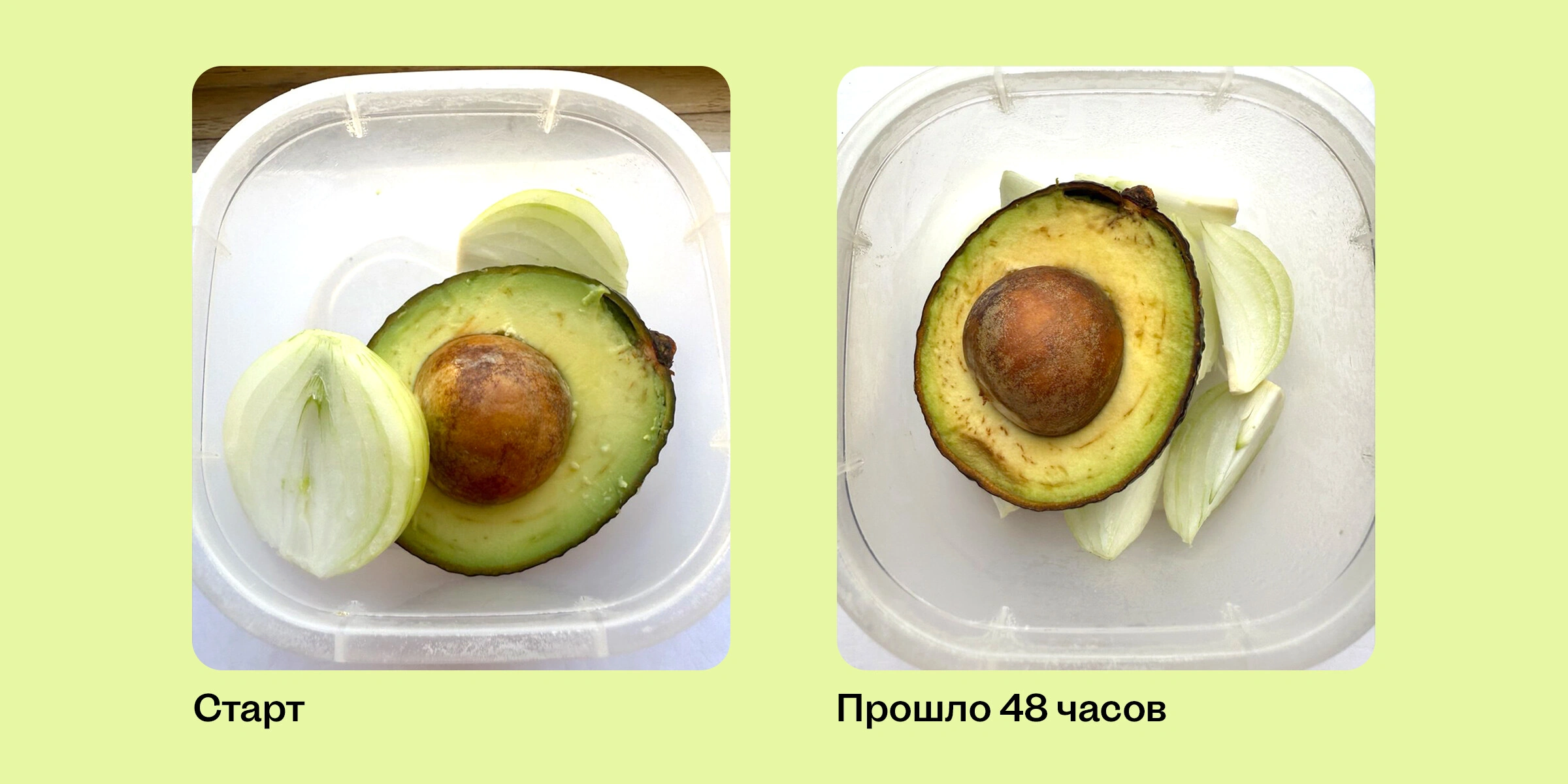 Итак, по итогам эксперимента рекомендуем по возможности есть авокадо сразу после разрезания или замораживать часть в виде пюре. Ну, а если половинка ушла на тосты или смузи на завтрак, то всегда можно запланировать салат с авокадо на ужин или убрать остаток продукта до завтра в контейнер с нарезанным луком. Варианты с лимонным соком и пищевой плёнкой также помогут в масштабе суток, но не стоит тратить оливковое масло — потемнение начнётся слишком быстро.