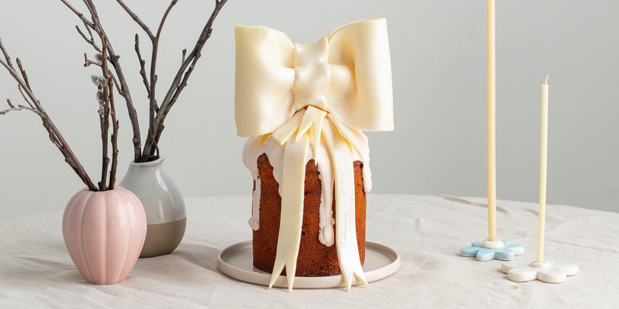 - Покройте кулич растопленным шоколадом или любой другой глазурью. Затем симметрично расположите на верхушке ленты из пластичного шоколада и установите бант.