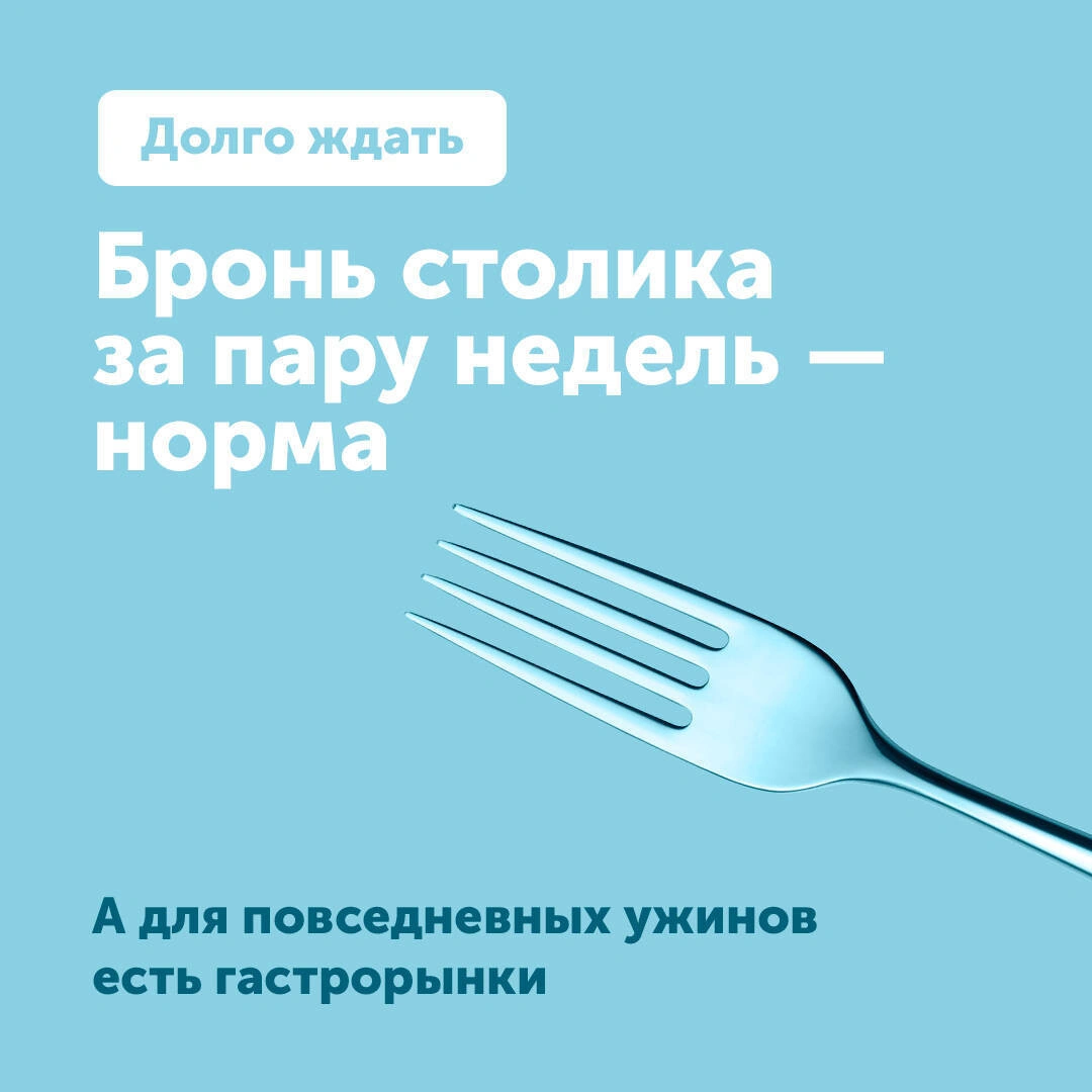 Одни рестораны принципиально уходят от бронирования, желая быть доступными для любой аудитории. Вторые, напротив, работают исключительно в формате предварительного бронирования. В обоих случаях гости могут только смириться с правилами. История сделала круг. Сначала ресторан был шикарным местом для особых случаев. Потом мы долго привыкали к тому, что ресторан — это просто место, в котором можно вкусно поесть. Теперь мы снова возвращаемся к бронированию столика за две-три недели. А для повседневных ужинов и обедов есть гастрономические рынки, где всегда свободен столик-другой.