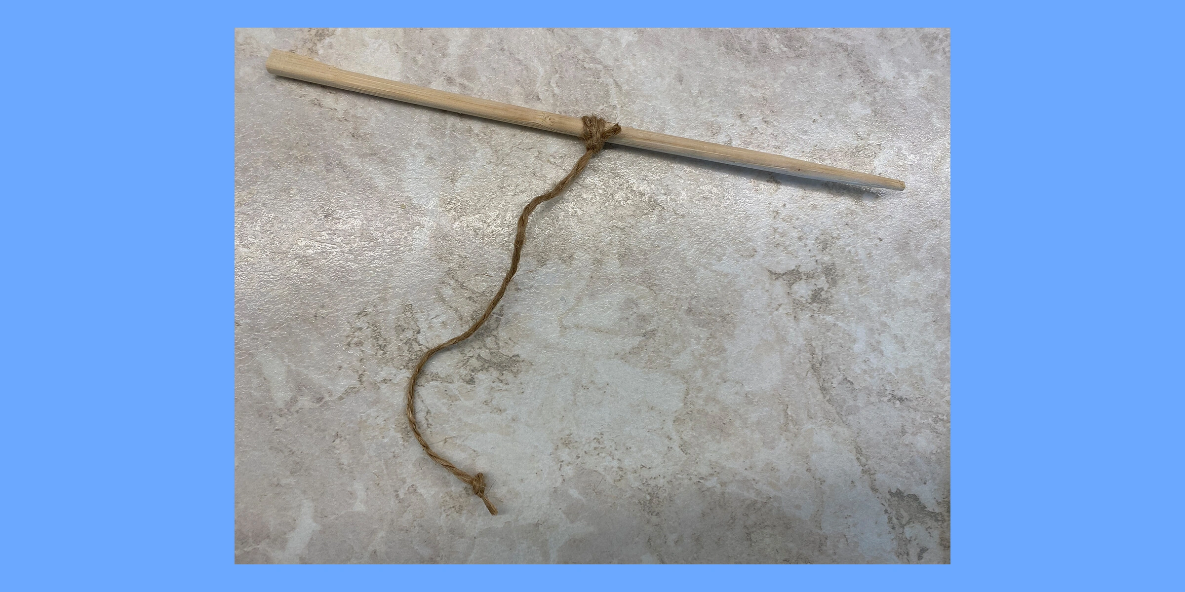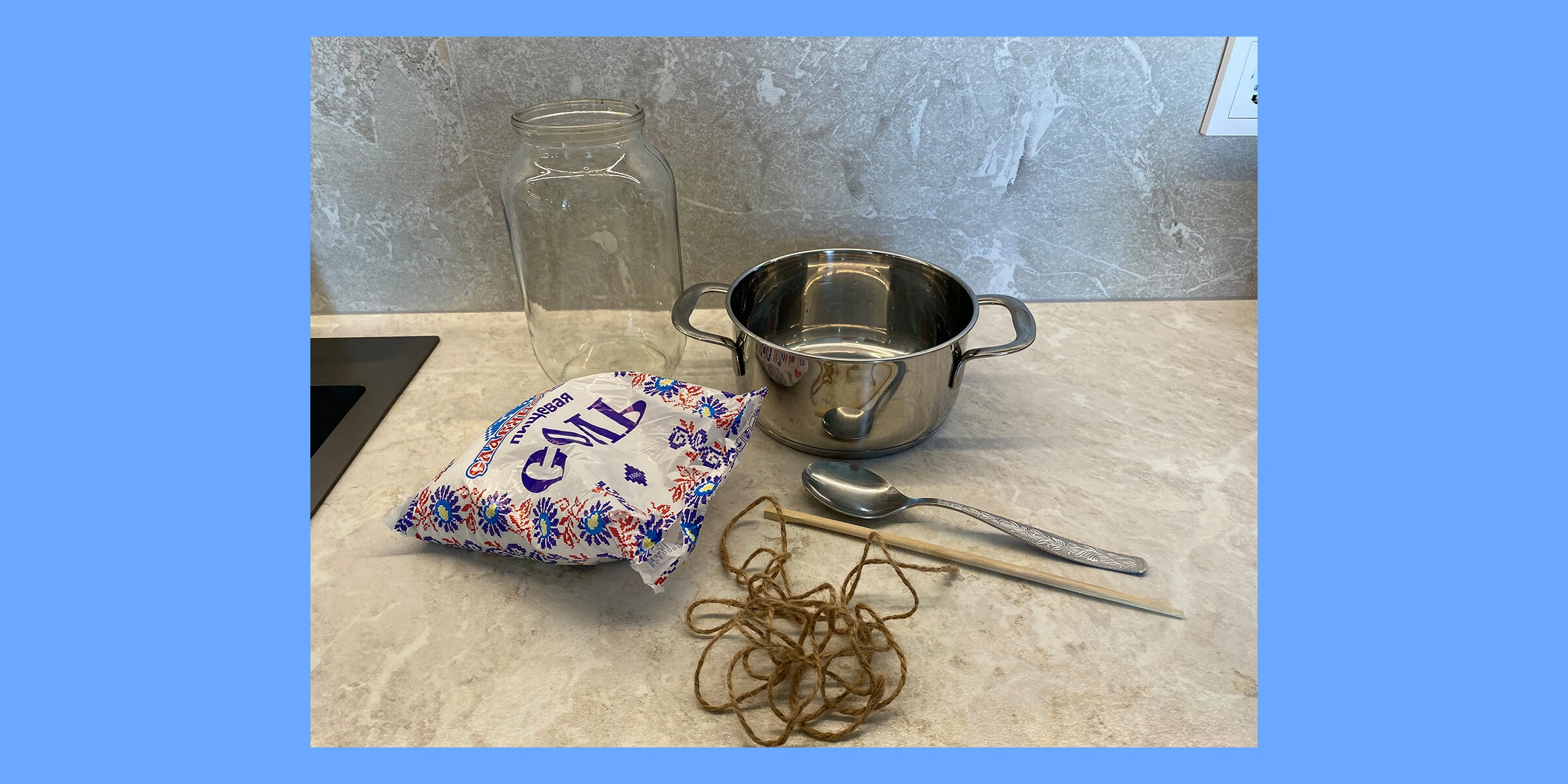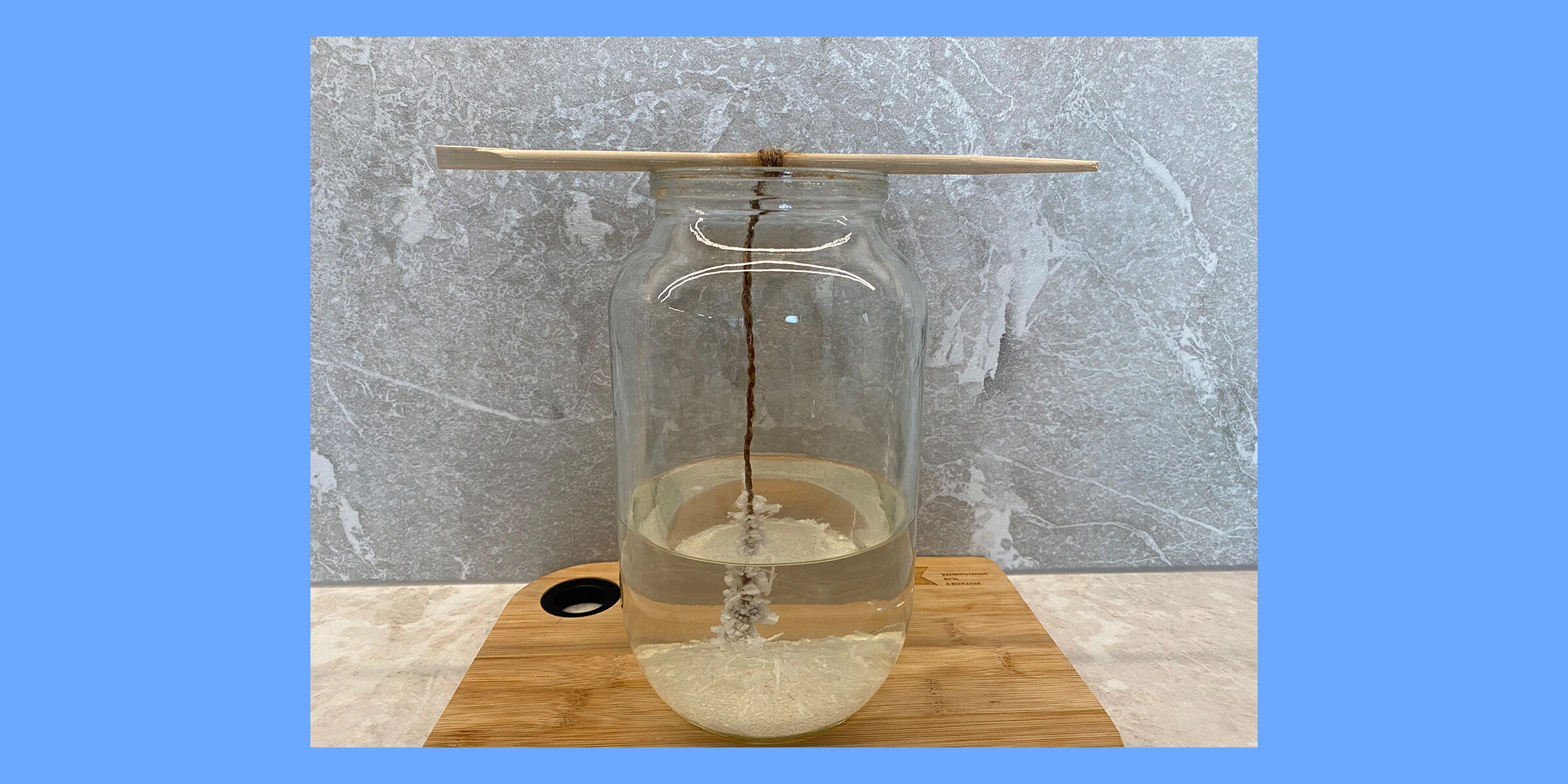 5. В качестве затравки можно использовать грубую фактурную бечёвку, один конец которой необходимо скрутить в узел, а другой — привязать к палочке. Альтернативный вариант — крупный кристалл соли, обмотанный тонкой ниткой. Второй её край привяжите к палочке.