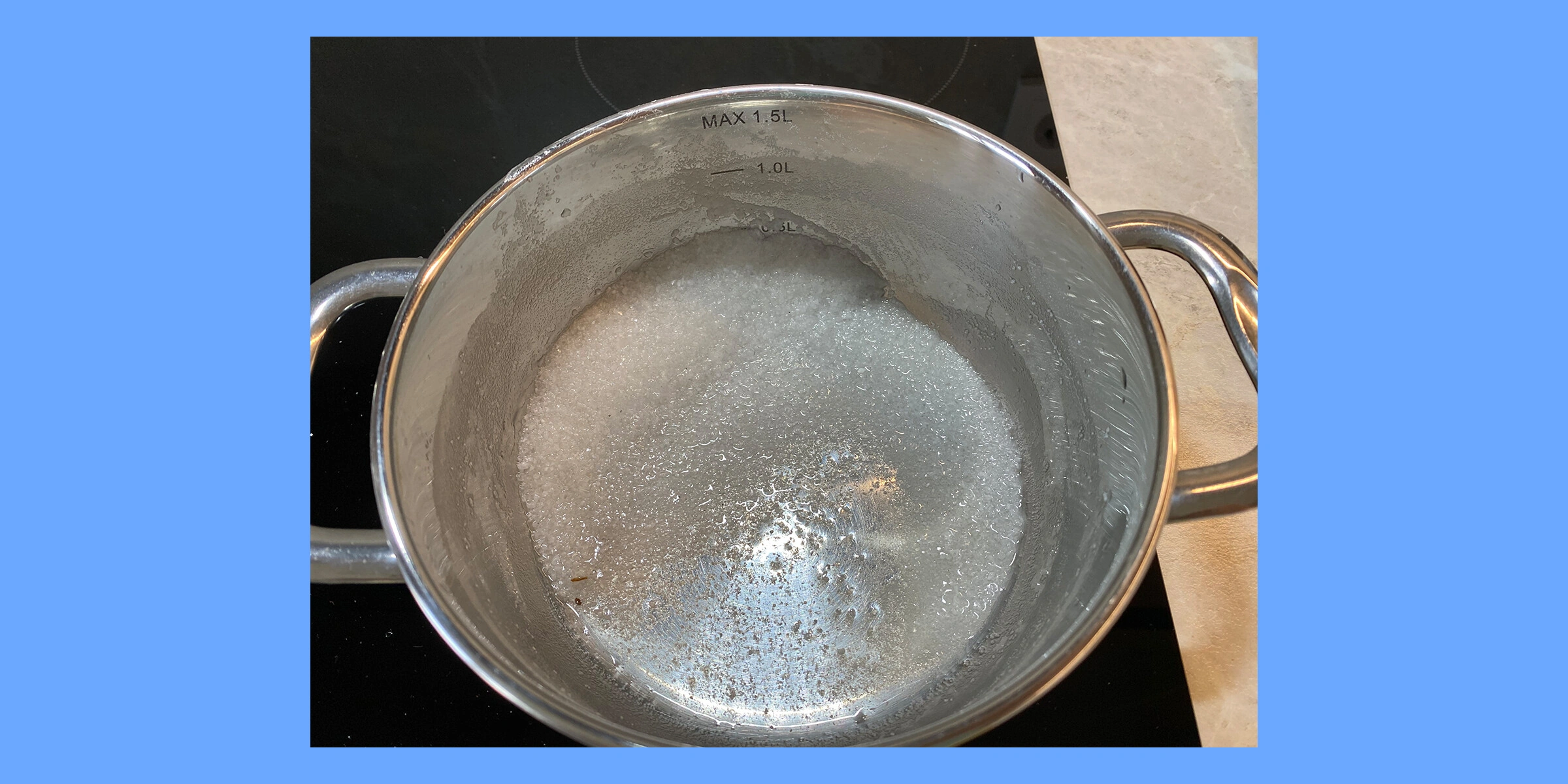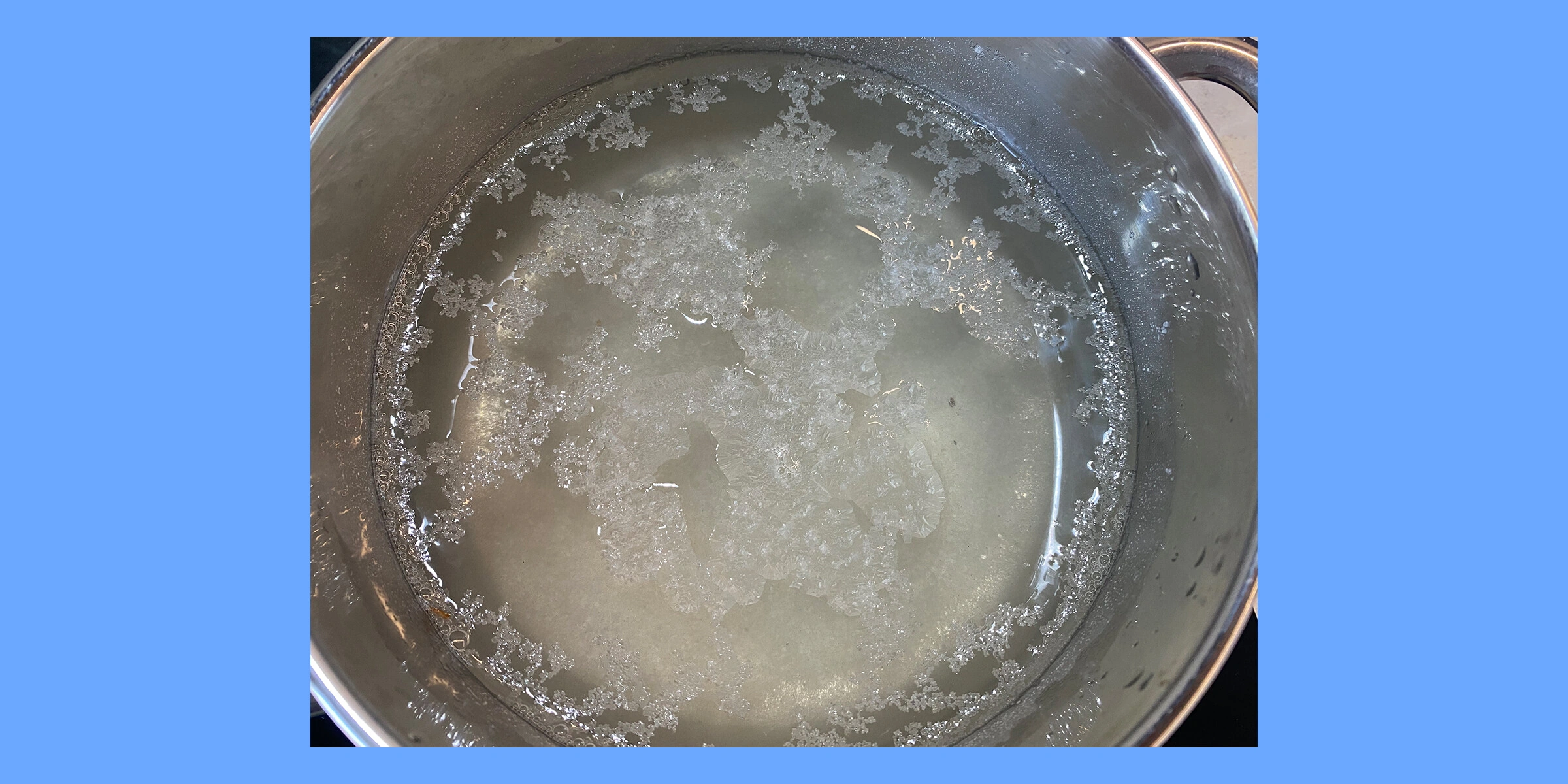 - Чтобы вырастить кристалл, нужно создать перенасыщенный солевой раствор. Вскипятите воду в кастрюле (количество жидкости зависит от размера ёмкости, в которой будете выращивать кристалл), а затем убавьте огонь/мощность. В опыте можно также использовать воду, предварительно нагретую в чайнике.