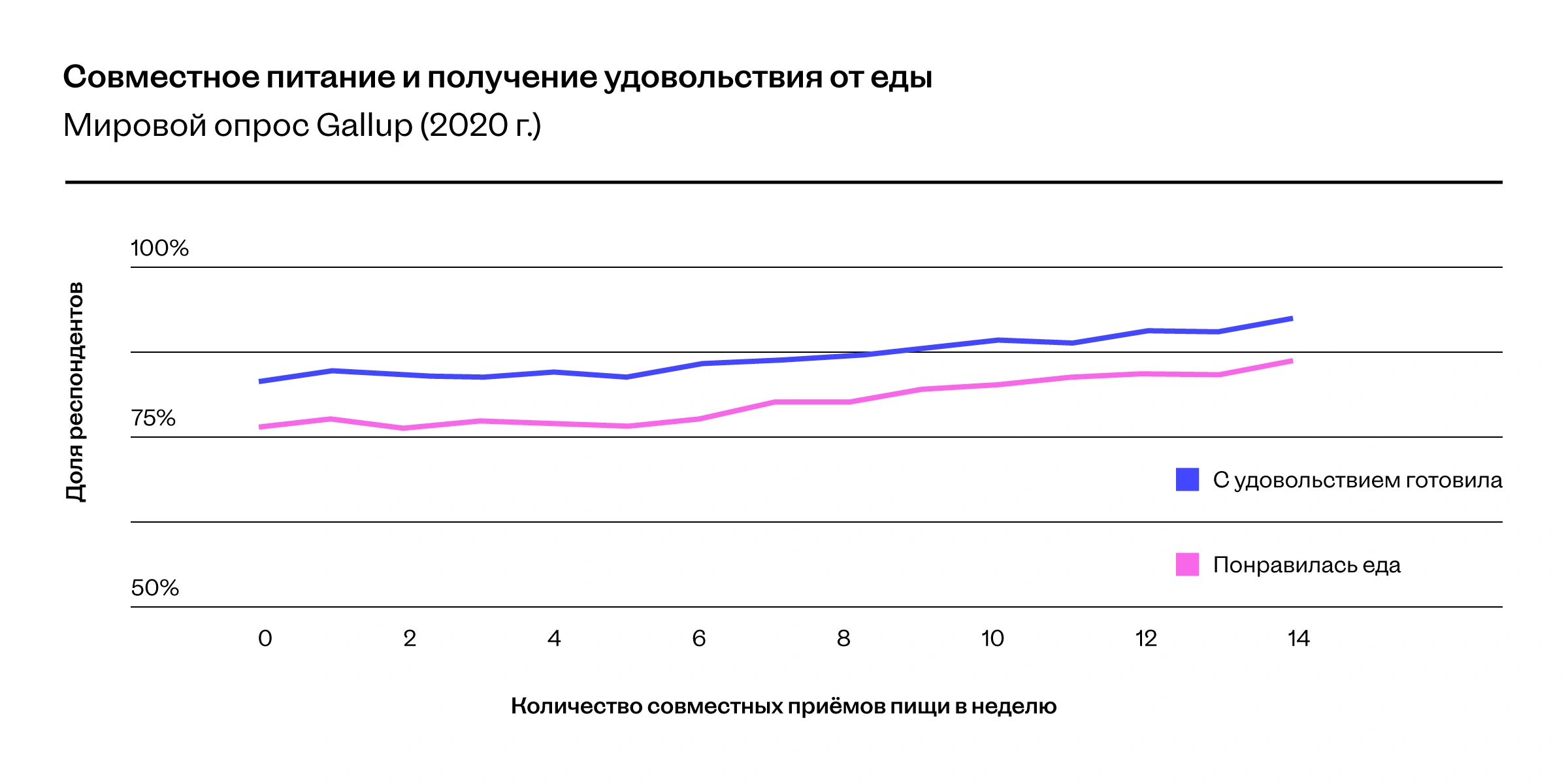 Отдельный график показывает, что чем чаще человек делился едой, приготовленной им самим или для него, тем больше удовлетворения она приносила. Почему так?