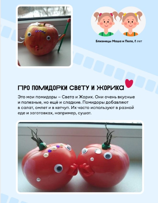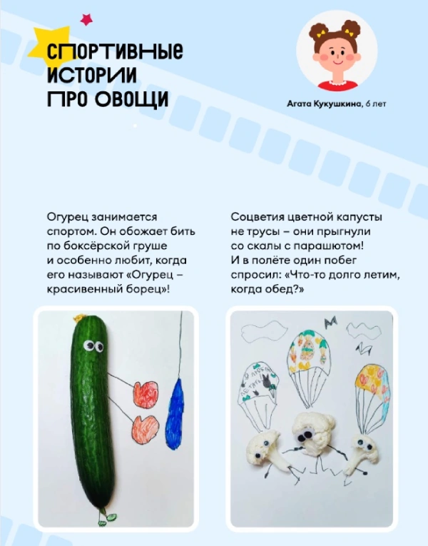 Чтобы наши маленькие покупатели подружились с овощами и фруктами, мы попросили вас вместе с детьми «оживить» морковку и брокколи, кабачки и горошек — всё, что любите или хотели бы полюбить. Нужно было придумать истории и сделать забавные фото с овощами, а мы обещали, что соберём ваши работы в книгу. Признаться, мы даже не ожидали такого энтузиазма и, конечно же, порадовались активности и фантазии, с которыми вы и ваши дети включились в этот движ. Надеемся, в процессе у ребят появились новые любимчики среди овощей и фруктов.