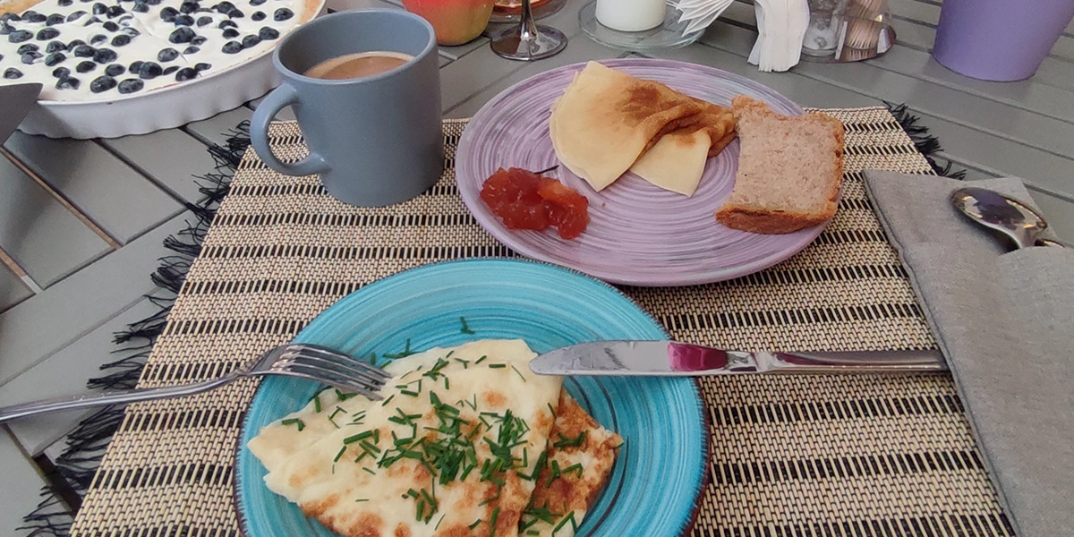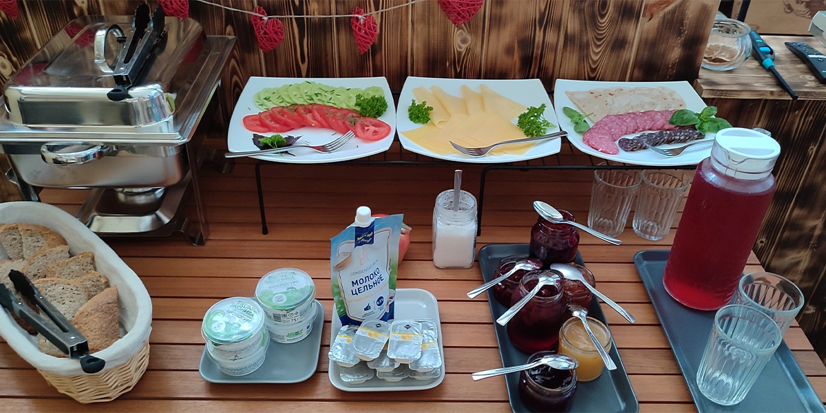 В стоимость проживания входит завтрак. Цельнозерновой хлеб и ветчину Ян делает сам, мёд и варенье тоже покупать не приходится, зелень, ягоды и овощи — с грядок, устроенных здесь же, в бывших кормушках рядом с бывшими коровниками. Простой и по-деревенски сытный обед и ужин (и сдобные трдельники с малиновым сорбетом на десерт!) можно заказать дополнительно. А вот о торкотинской фишке и номинанте национальной премии Russian Traveler Awards 2024 — мещовском гусе — нужно договариваться отдельно.