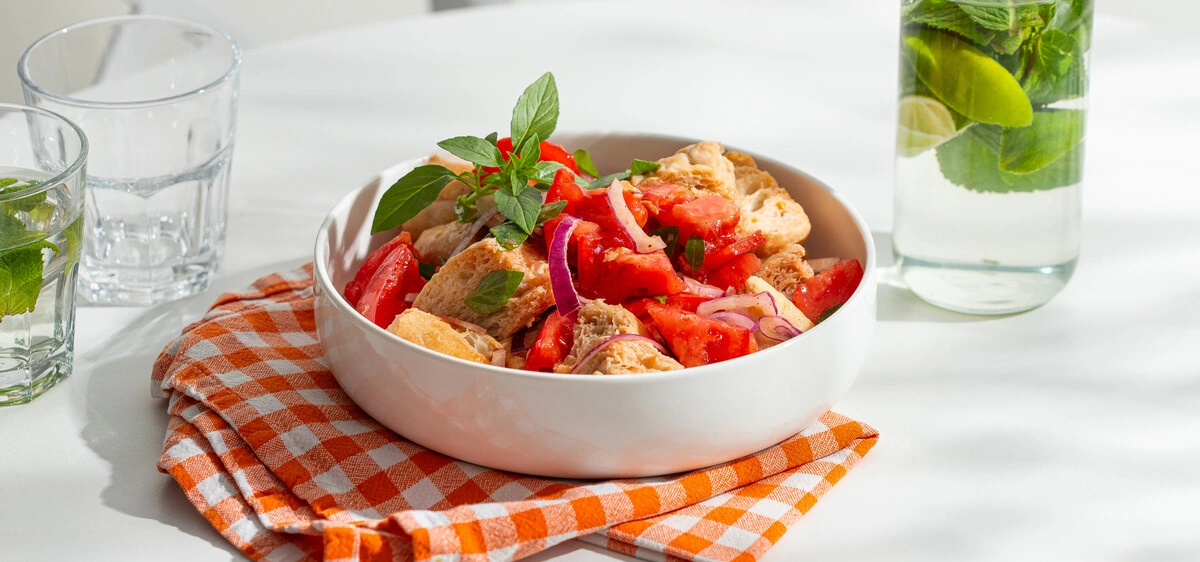 Этот простой, но потрясающе вкусный салат родом из солнечной Италии — идеальная закуска для лета. Главный секрет рецепта панцанеллы — помидоры: выбирайте самые сочные и спелые.